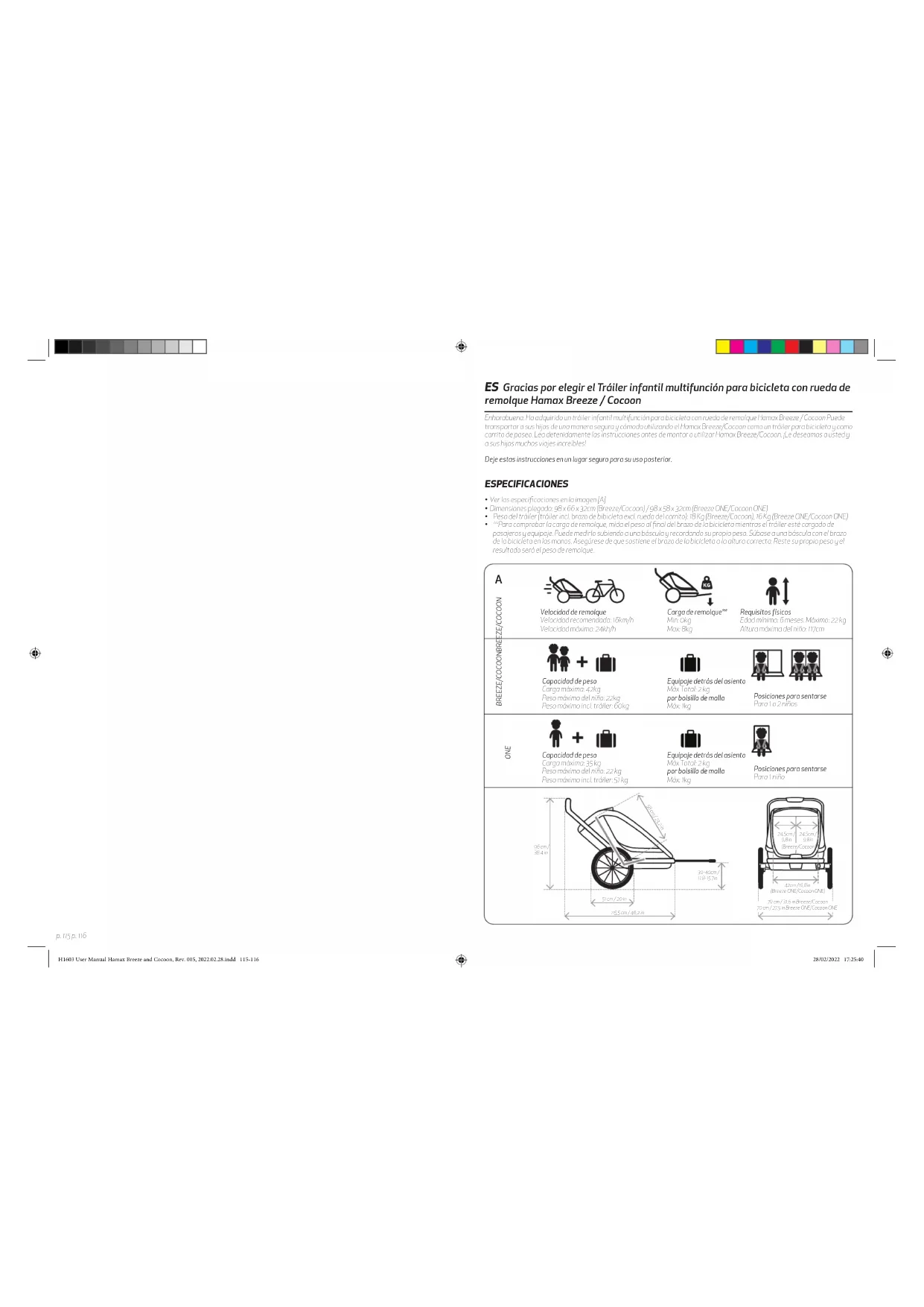 - **Para comprobar la carga de remolque, mida el peso al final del brazo de la bicicleta mientras el tráiler esté cargado de pasajeros y equipaje. Puede medirlo subiendo a una báscula y recordando su propio peso. Súbase a una báscula con el brazo de la bicicleta en las manos. Asegúrese de que sostiene el brazo de la bicicleta a la altura correcta. Reste su propio peso y el resultado será el peso de remolque. Velocidad de remolque Velocidad recomendada: 16km/h Velocidad máxima: 24kh/h Capacidad de peso Carga máxima: 42kg Peso máximo del niño: 22kg Peso máximo incl. tráiler: 60kg Carga de remolque** Min: 0kg Max: 8kg Posiciones para sentarse Para 1 o 2 niños Equipaje detrás del asiento Máx Total: 2 kg por bolsillo de malla Máx: 1kg Requisitos físicos Edad mínima: 6 meses. Máximo: 22 kg Altura máxima del niño: 117cm Capacidad de peso Carga máxima: 35 kg Peso máximo del niño: 22 kg Peso máximo incl. tráiler: 51 kg Posiciones para sentarse Para 1 niño Equipaje detrás del asiento Máx Total: 2 kg por bolsillo de malla Máx: 1kg H1603 User Manual Hamax Breeze and Cocoon, Rev. 005, 2022.02.28.indd 115-116H1603 User Manual Hamax Breeze and Cocoon, Rev. 005, 2022.02.28.indd 115-116 28/02/2022 17:25:4028/02/2022 17:25:40p. 117 p. 118