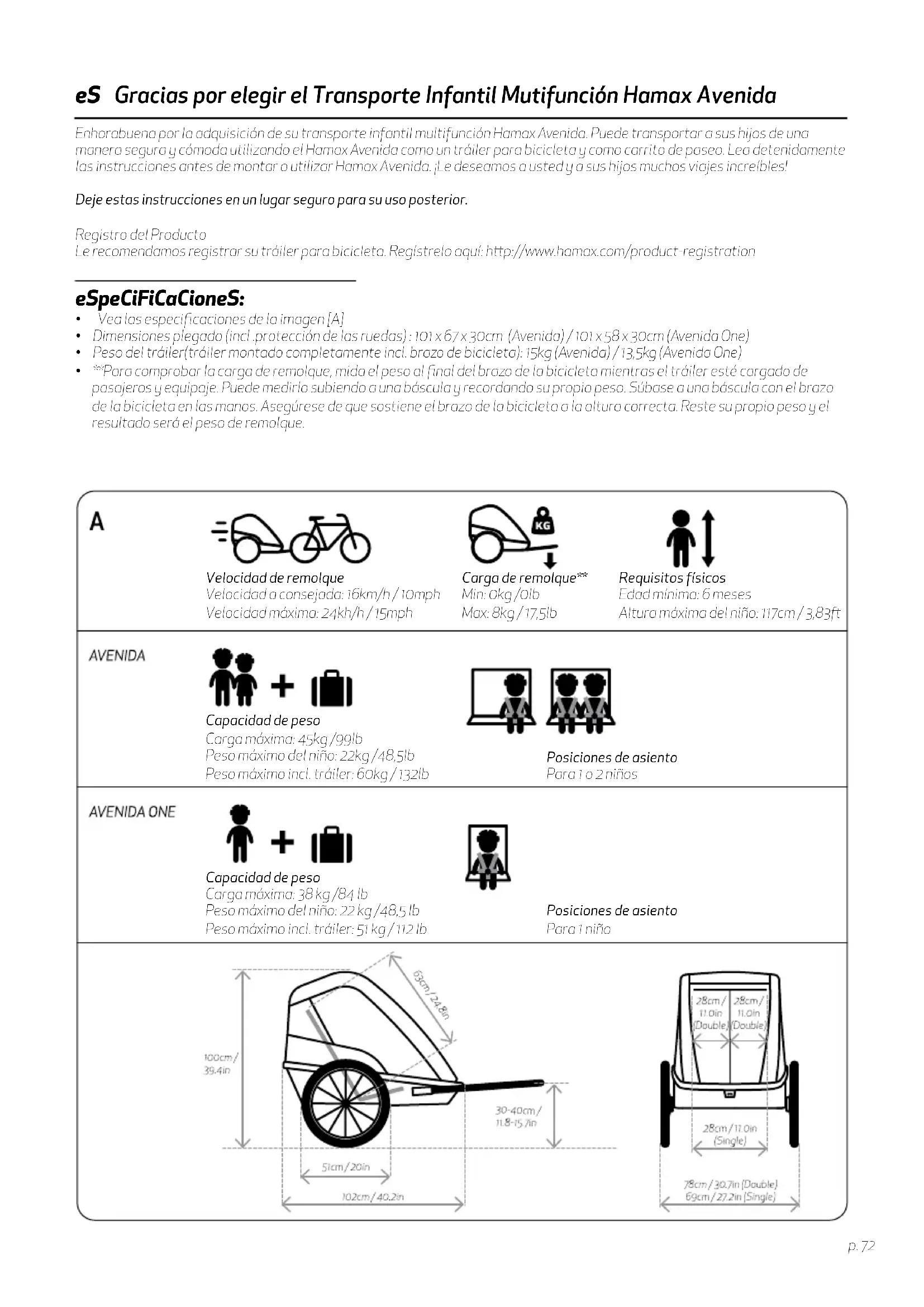 - Si el tráiler se ve envuelto en algún accidente o sufre algún daño, diríjase a la casa distribuidora para comprobar que pueda seguir utilizándose. gaRantÍa El Transporte Infantil Multifunción Hamax Avenida tiene garantía desde la fecha de su compra. El periodo de garantía depende de la legislación del país en cuestión. La garantía es aplicable a defectos en los materiales o en la mano de obra y no cubre daños debidos al uso inadecuado, falta de mantenimiento, incapacidad para seguir el manual de instrucciones, uso de la fuerza o el desgaste habitual. La garantía solo es válida para el usuario original. Por favor, lea detenidamente las recomendaciones de uso y mantenimiento. Las condiciones que puedan provocar el desgaste prematuro de este producto no estarán cubiertas por esta garantía. Si se requiriese de algún servicio para este producto o si quisiera hacer una reclamación de garantía, contacte con el distribuidor al que se lo compró.p. 77 fi Kiitos, eä valitsit Hamax Avenida -lasten monitoimivaunun Onnielut ostamastasi Hamax Avenida -lasten monitoimivaunusta. Voit kuljeaa lastasi turvallisella ja mukavalla tavalla käyämällä Hamax Avenidaa polkupyörän vetovaununa tai raaina. Lue ohjeet huolellisesti ennen Hamax Avenida -tuoeen kokoamista tai käyöä. Toivotamme sinulle ja lapsillesi mukavia yhteisiä retkiä! Säilytä ohjeet varmassa paikassa myöhempää käyöä varten. Tuoeen rekisteröiminen Suosielemme, eä rekisteröit polkupyörän vetovaunun. Rekisteröi se täällä: hp://www.hamax.com/product-registration Tekniset tiedot