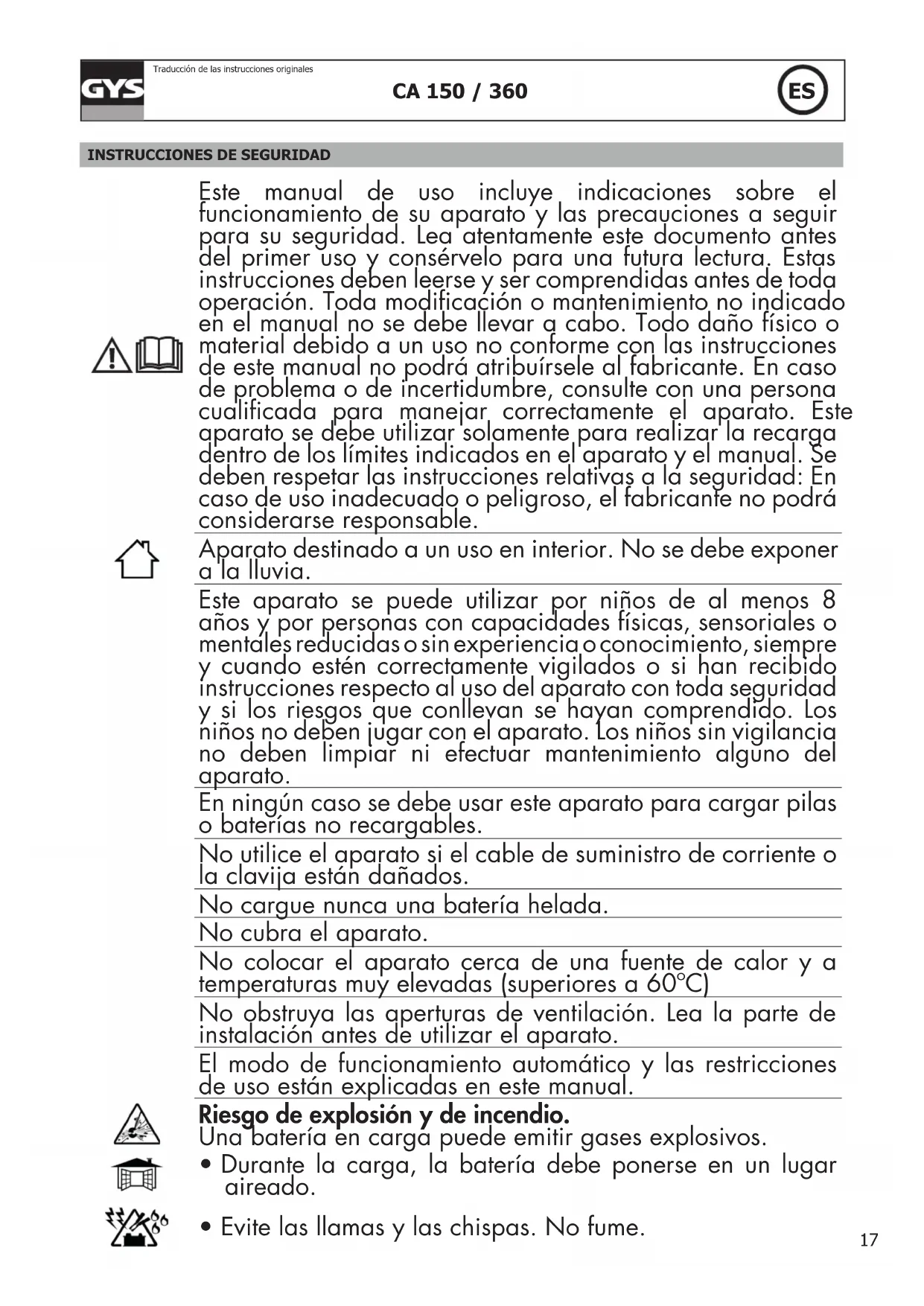 Traducción de las instrucciones originales OBSERVACIONES ◊ Conexión y desconexión Disconectar la batería de todo sístemo electrónico durante la carga (no cargar la batería cuando está conectada al vehículo) (CA 360 en modo manual). ◊ Arranque No se debe nunca arrancar el vehículo con el cargador conectado. Podría fundir el fusible. ◊ Anomalía Una carga demasiado rápida puede provocar una anomalía: - el fusible se funde y se detiene la carga. - la luz «OK» se enciende sin que la batería esté cargada, y se activa y se desactiva de forma regular. En este caso, es necesario volver a poner el aparato en marcha tras elegir una velocidad de carga más débil. ◊ Protección térmica El transformador de su aparato posee une termostato equipado. Si no consiguiera evacuar el calor, detiene su funcionamiento. Ponga el aparato en un lugar aireado, espere a que se enfríe y retome la carga (espera de 15 minutos aproximadamente). ◊ Fusibles El fusible contribuye a la protección de su aparato en los siguientes casos: - Inversión de polaridad o cortocircuitos por contacto directo entre las pinzas. - Arranque del vehículo con la batería conectada. - Corriente de carga durante demasiado tiempo en modo Boost o demasiado fuerte y más allá de la corriente nominal del modo estándar. En casa de rotura del fusible, desconecte las pinzas de la batería, ponga el interruptor en modo apagado, cambie el fusible respectando su calibre, ponga la velocidad mínima y recomience el proceso de conexión indicado aquí abajo. CA 150 CA 360 Primary fuse (No Gys reference for sells) Cylindrical 5×20mm - T3.15A Littelfuse reference : 02153.15MXP (No Gys reference for sells) Cylindrical 5× 20mm - T5A Littelfuse reference : 0215005.MXP Secondary fuse Gys reference : 054516 Type : ATOF blade - 25A Littelfuse reference : 287025.PXPV Gys reference : 054622 Type: BF1 – M5 - 32V 50A Littelfuse reference : 153.5631.5502 ◊ Batería sulfatada Estas baterías que llevan demasiado tiempo sin mantenimiento se pueden recargar a veces. Reconocer una batería sul- fatada cuando la cargamos es simple, la aguja del ampermetro no se mueve (se queda en 0) o en modo automático el cargador se interrumpe rápidamente. En este caso, coloque el cargador en posición «Manual» (CA 360) y luego coloque el conmutador sobre la velocidad más alta y vigile que el cargador cada hora. Si tras 5 horas la aguja sigue sin moverse, la batería no puede usarse.