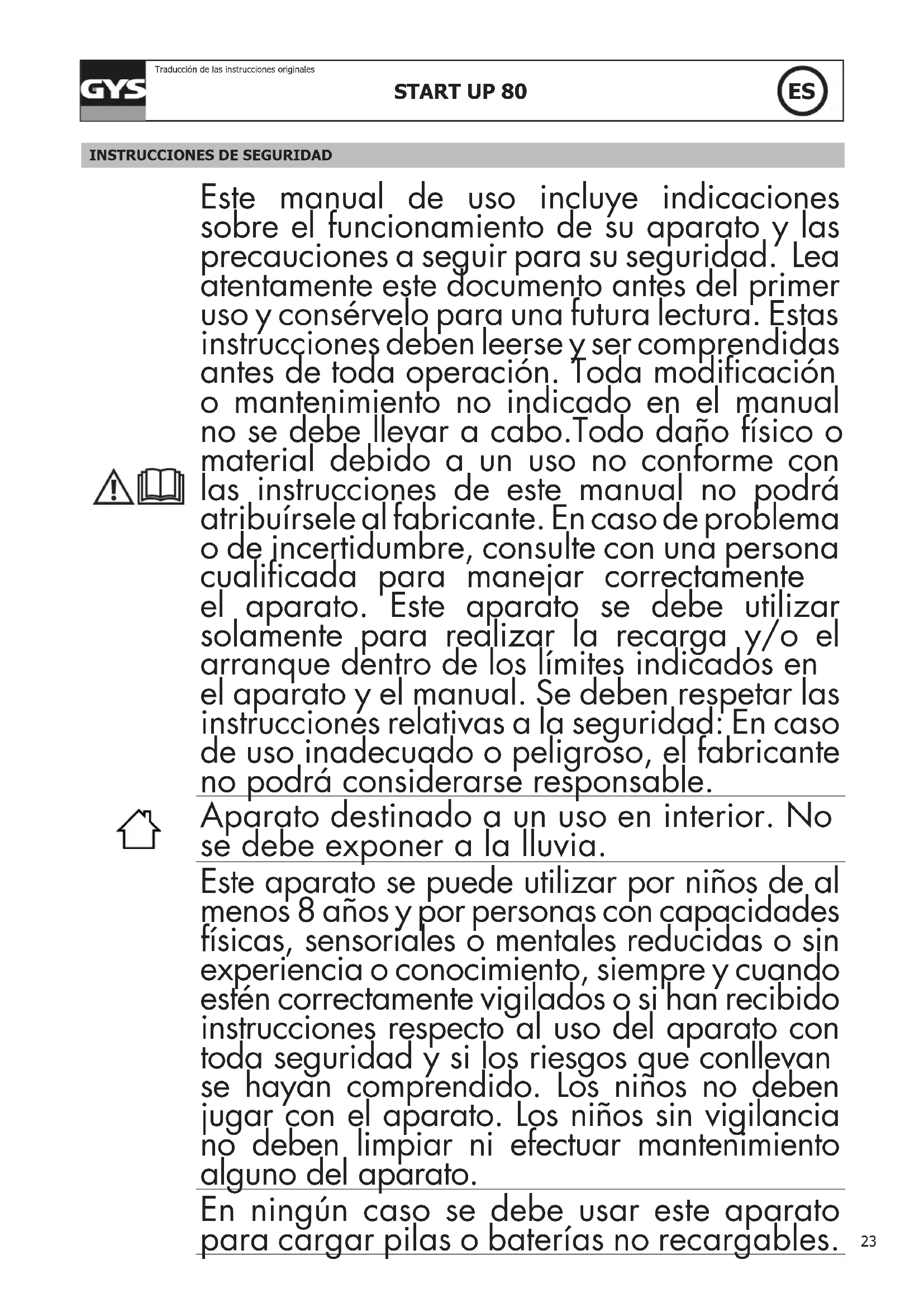 Este manual de uso incluye indicaciones sobre el funcionamiento de su aparato y las precauciones a seguir para su seguridad. Lea atentamente este documento antes del primer uso y consérvelo para una futura lectura. Estas instrucciones deben leerse y ser comprendidas antes de toda operación. Toda modicación o mantenimiento no indicado en el manual no se debe llevar a cabo.Todo daño físico o material debido a un uso no conforme con las instrucciones de este manual no podrá atribuírsele al fabricante. En caso de problema o de incertidumbre, consulte con una persona cualicada para manejar correctamente el aparato. Este aparato se debe utilizar solamente para realizar la recarga y/o el arranque dentro de los límites indicados en el aparato y el manual. Se deben respetar las instrucciones relativas a la seguridad: En caso de uso inadecuado o peligroso, el fabricante no podrá considerarse responsable. Aparato destinado a un uso en interior. No se debe exponer a la lluvia. Este aparato se puede utilizar por niños de al menos 8 años y por personas con capacidades físicas, sensoriales o mentales reducidas o sin experiencia o conocimiento, siempre y cuando estén correctamente vigilados o si han recibido instrucciones respecto al uso del aparato con toda seguridad y si los riesgos que conllevan se hayan comprendido. Los niños no deben jugar con el aparato. Los niños sin vigilancia no deben limpiar ni efectuar mantenimiento alguno del aparato. En ningún caso se debe usar este aparato para cargar pilas o baterías no recargables.24 START UP 80