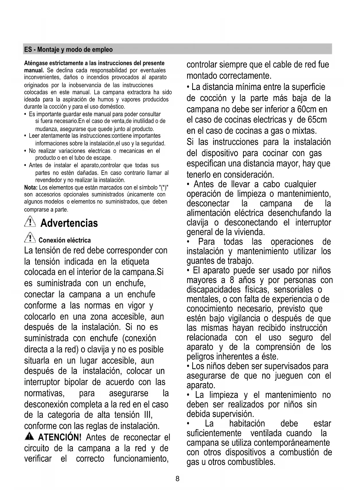 ES - Montaje y modo de empleo Aténgase estrictamente a las instrucciones del presente manual. Se declina cada responsabilidad por eventuales inconvenientes, daños o incendios provocados al aparato originados por la inobservancia de las instrucciones colocadas en este manual. La campana extractora ha sido ideada para la aspiración de humos y vapores producidos durante la cocción y para el uso doméstico.