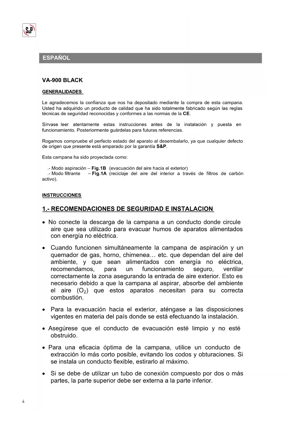 Le agradecemos la confianza que nos ha depositado mediante la compra de esta campana. Usted ha adquirido un producto de calidad que ha sido totalmente fabricado según las reglas técnicas de seguridad reconocidas y conformes a las normas de la CE. Sírvase leer atentamente estas instrucciones antes de la instalación y puesta en funcionamiento. Posteriormente guárdelas para futuras referencias. Rogamos compruebe el perfecto estado del aparato al desembalarlo, ya que cualquier defecto de origen que presente está amparado por la garantía S&P. Esta campana ha sido proyectada como: .- Modo aspiración – Fig.1B (evacuación del aire hacia el exterior) .- Modo filtrante – Fig.1A (reciclaje del aire del interior a través de filtros de carbón activo).