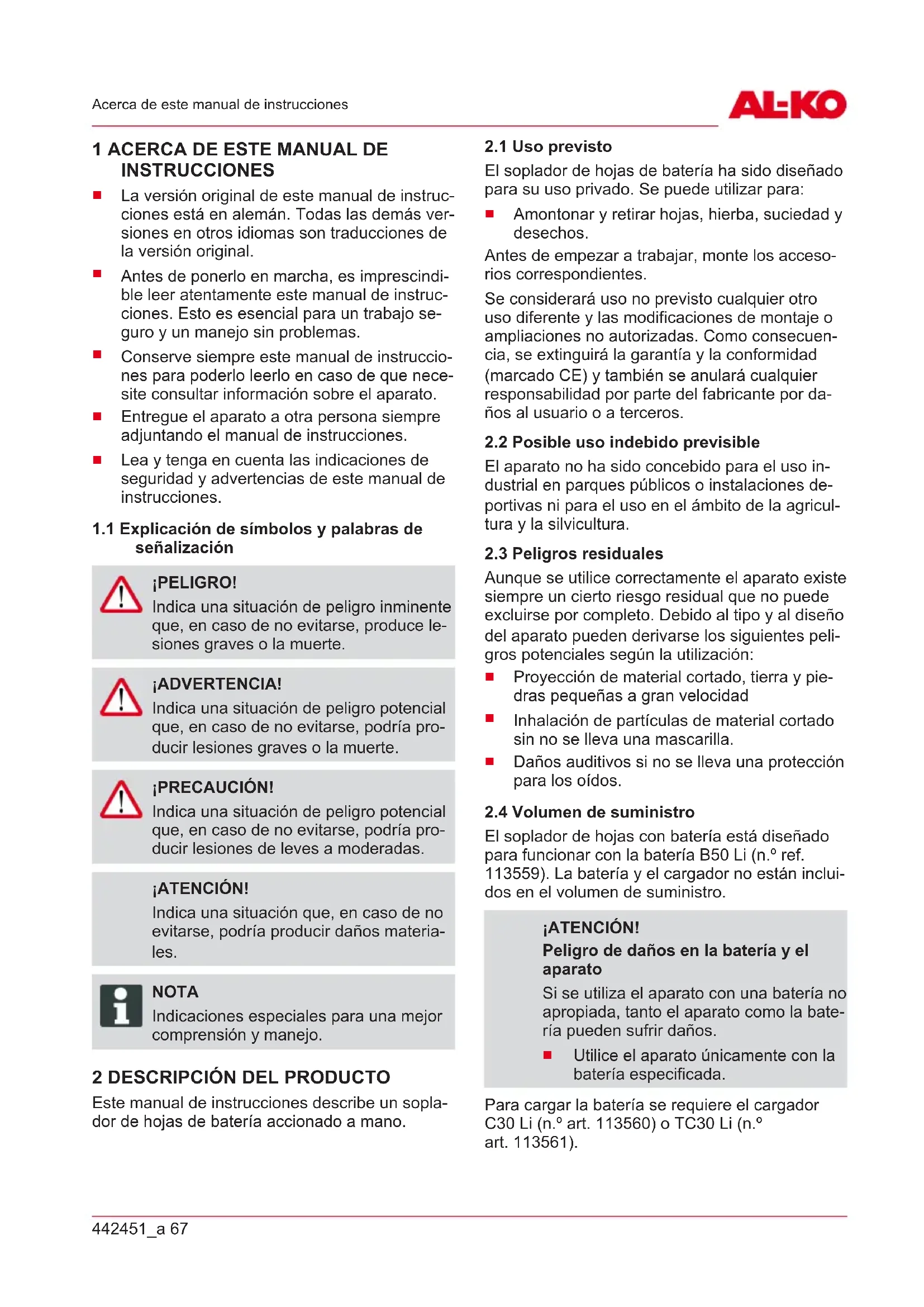 Utilice el aparato únicamente con la batería especificada. Para cargar la batería se requiere el cargador C30 Li (n.º art.113560) o TC30 Li (n.º art.113561).ES 68 LB 2060 Instrucciones de seguridad NOTA Encontrará más información en los si- guientes manuales de instrucciones: