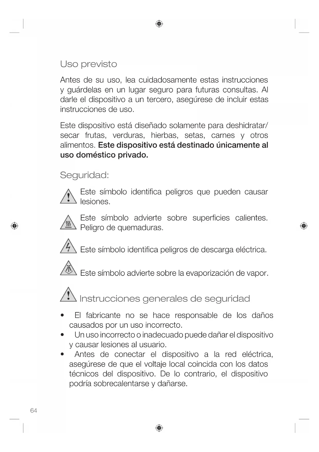 Este dispositivo está Diseño solamente para deshidratar/segar frutas, verduras, hierbas, setas, carnes y otros alimentos. Este dispositivo está asignado únicamente al uso doméstico privado.