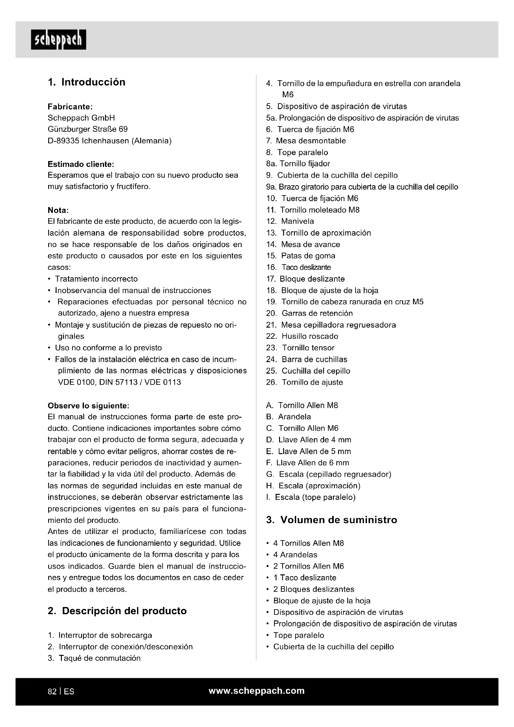 Fabricante: Scheppach GmbH Günzburger Straße 69 D-89335 Ichenhausen (Alemania) Estimado cliente: Esperamos que el trabajo con su nuevo producto sea muy satisfactorio y fructífero. Nota: El fabricante de este producto, de acuerdo con la legis- lación alemana de responsabilidad sobre productos, no se hace responsable de los daños originados en este producto o causados por este en los siguientes casos: