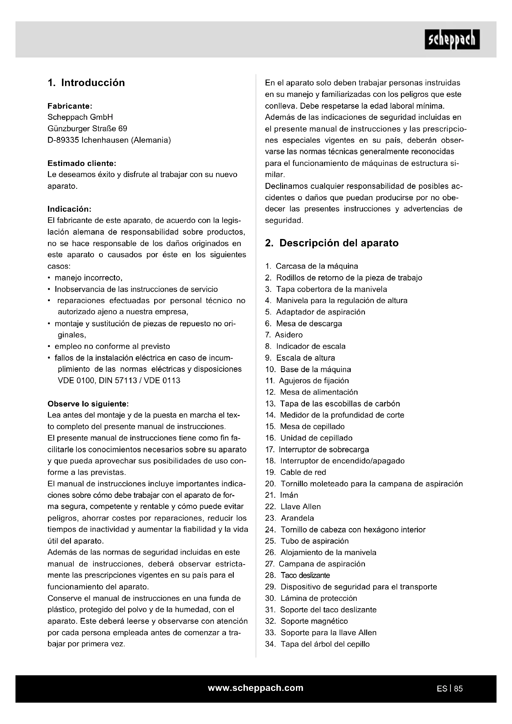 Fabricante: Scheppach GmbH Günzburger Straße 69 D-89335 Ichenhausen (Alemania) Estimado cliente: Le deseamos éxito y disfrute al trabajar con su nuevo aparato. Indicación: El fabricante de este aparato, de acuerdo con la legis- lación alemana de responsabilidad sobre productos, no se hace responsable de los daños originados en este aparato o causados por éste en los siguientes casos: