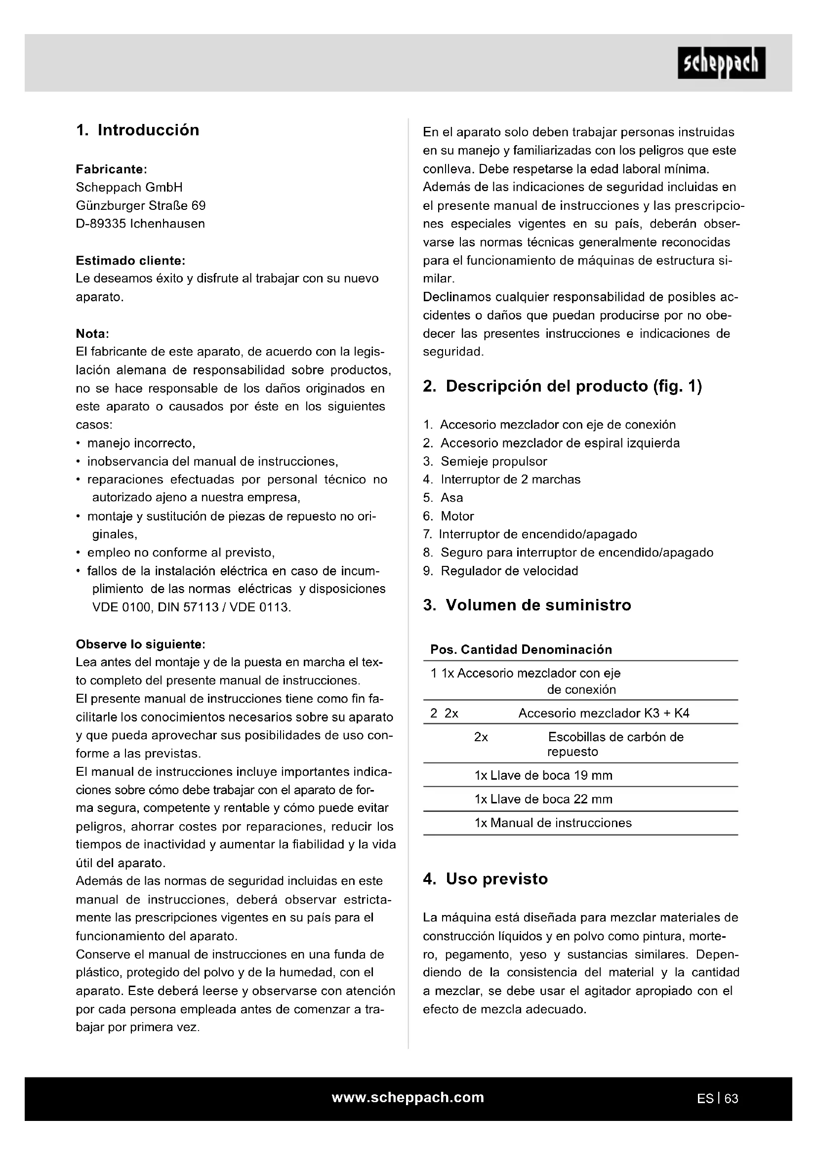 La máquina está diseñada para mezclar materiales de construcción líquidos y en polvo como pintura, morte- ro, pegamento, yeso y sustancias similares. Depen- diendo de la consistencia del material y la cantidad a mezclar, se debe usar el agitador apropiado con el efecto de mezcla adecuado.www.scheppach.com