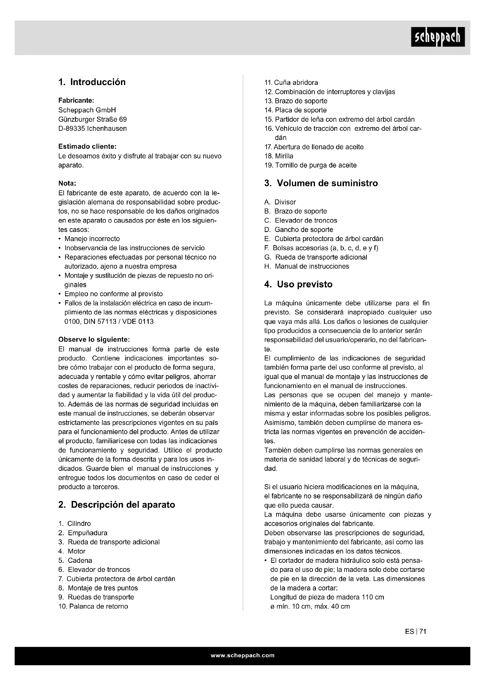 Fabricante: Scheppach GmbH Günzburger Straße 69 D-89335 Ichenhausen Estimado cliente: Le deseamos éxito y disfrute al trabajar con su nuevo aparato. Nota: El fabricante de este aparato, de acuerdo con la le- gislación alemana de responsabilidad sobre produc- tos, no se hace responsable de los daños originados en este aparato o causados por éste en los siguien- tes casos: