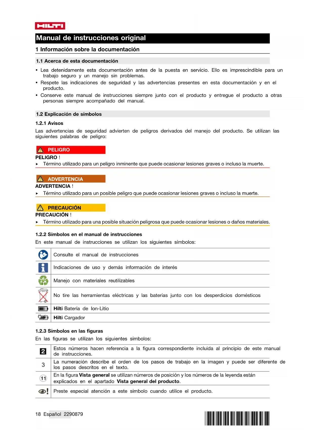 En este manual de instrucciones se utilizan los siguientes símbolos: Consulte el manual de instrucciones Indicaciones de uso y demás información de interés Manejo con materiales reutilizables No tire las herramientas eléctricas y las baterías junto con los desperdicios domésticos Hilti Batería de Ion-Litio Hilti Cargador