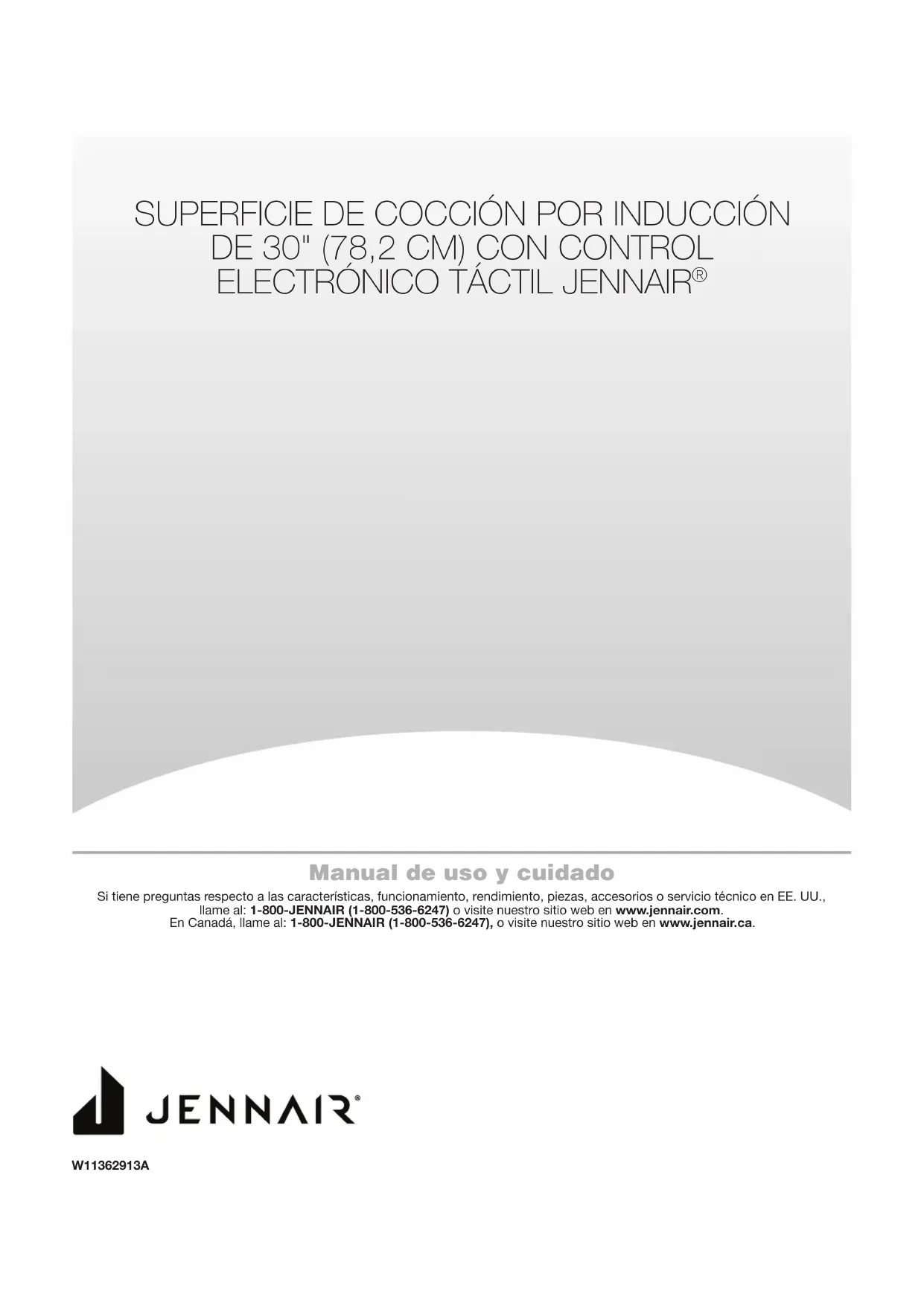 pour cuisine et appareils ménagers Commander la pièce nºW10355010Manual de uso y cuidado Si tiene preguntas respecto a las características, funcionamiento, rendimiento, piezas, accesorios o servicio técnico en EE.UU., llame al: 1-800-JENNAIR (1-800-536-6247) o visite nuestro sitio web en www.jennair.com. En Canadá, llame al: 1-800-JENNAIR (1-800-536-6247), o visite nuestro sitio web en www.jennair.ca. W11362913A SUPERFICIE DE COCCIÓN POR INDUCCIÓN