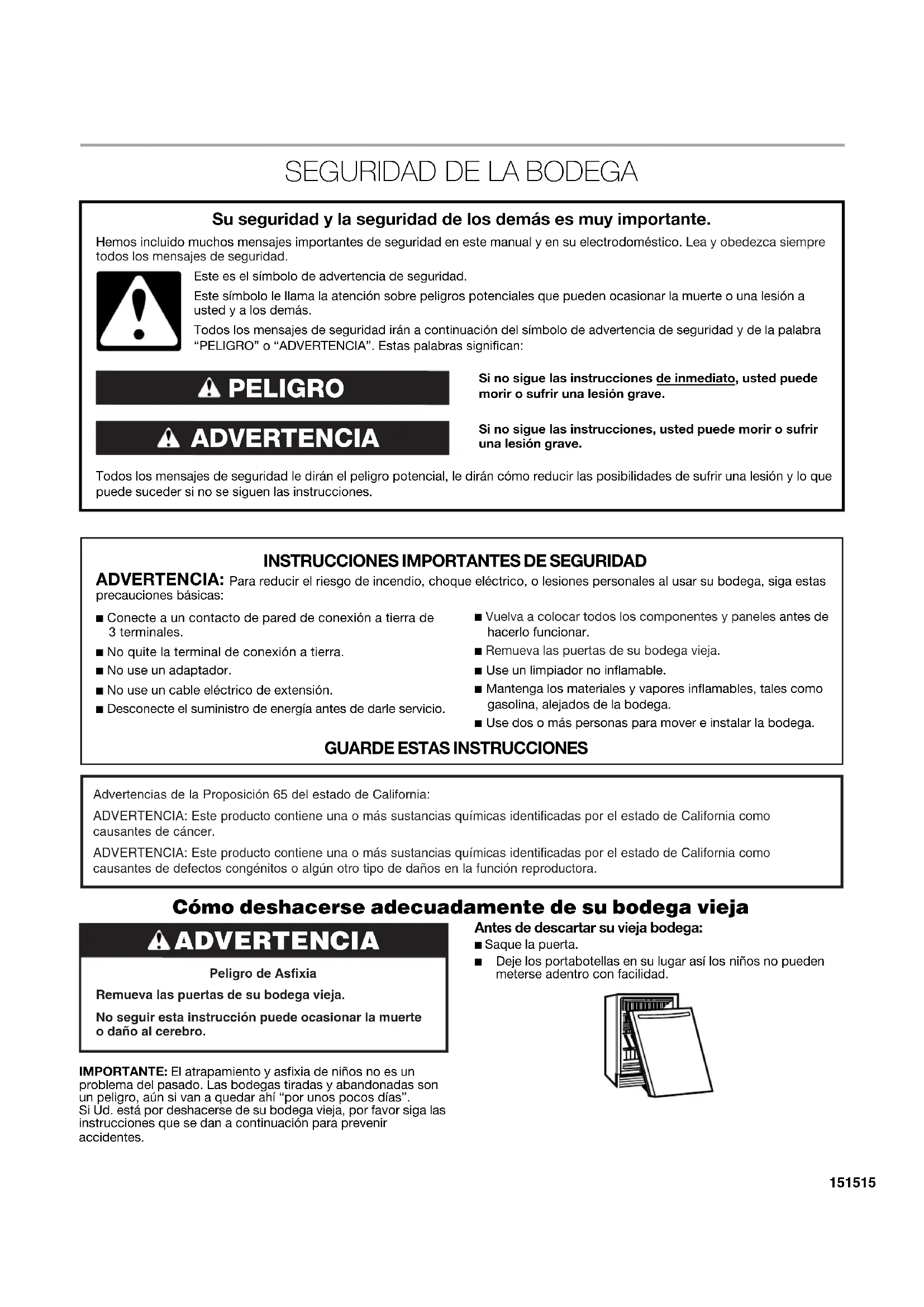Cómo deshacerse adecuadamente de su bodega vieja IMPORTANTE: El atrapamiento y asfixia de niños no es un problema del pasado. Las bodegas tiradas y abandonadas son un peligro, aún si van a quedar ahí “por unos pocos días”. Si Ud. está por deshacerse de su bodega vieja, por favor siga las instrucciones que se dan a continuación para prevenir accidentes.Antes de descartar su vieja bodega:■ Saque la puerta. ■ Deje los portabotellas en su lugar así los niños no pueden meterse adentro con facilidad. Si no sigue las instrucciones de inmediato, usted puede morir o sufrir una lesión grave. Si no sigue las instrucciones, usted puede morir o sufrir una lesión grave. Todos los mensajes de seguridad le dirán el peligro potencial, le dirán cómo reducir las posibilidades de sufrir una lesión y lo que puede suceder si no se siguen las instrucciones. Su seguridad y la seguridad de los demás es muy importante. Hemos incluido muchos mensajes importantes de seguridad en este manual y en su electrodoméstico. Lea y obedezca siempre todos los mensajes de seguridad. ADVERTENCIA PELIGRO Este es el símbolo de advertencia de seguridad.Este símbolo le llama la atención sobre peligros potenciales que pueden ocasionar la muerte o una lesión a usted y a los demás.Todos los mensajes de seguridad irán a continuación del símbolo de advertencia de seguridad y de la palabra “PELIGRO” o “ADVERTENCIA”. Estas palabras significan: