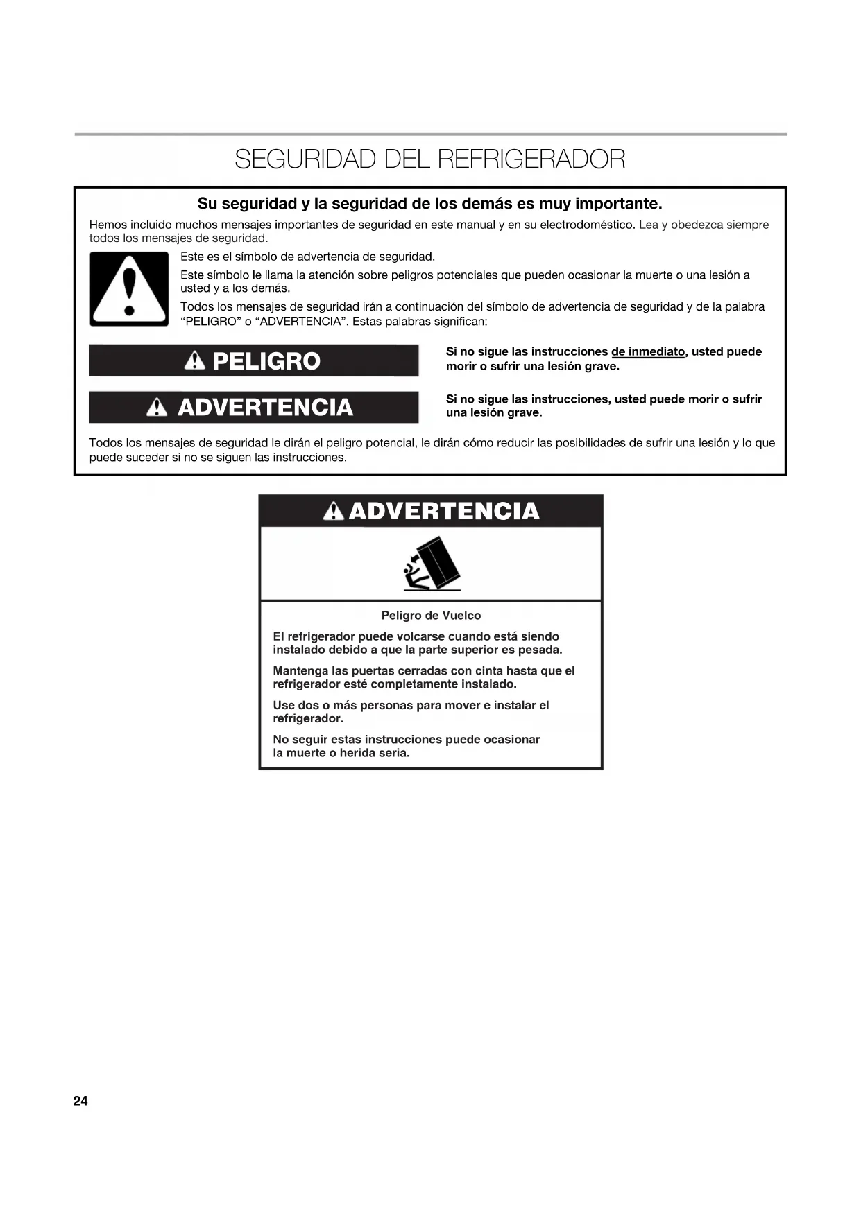 Si no sigue las instrucciones de inmediato, usted puede morir o sufrir una lesión grave. Si no sigue las instrucciones, usted puede morir o sufrir una lesión grave. Todos los mensajes de seguridad le dirán el peligro potencial, le dirán cómo reducir las posibilidades de sufrir una lesión y lo que puede suceder si no se siguen las instrucciones. Su seguridad y la seguridad de los demás es muy importante. Hemos incluido muchos mensajes importantes de seguridad en este manual y en su electrodoméstico. Lea y obedezca siempre todos los mensajes de seguridad. ADVERTENCIA PELIGRO Este es el símbolo de advertencia de seguridad. Este símbolo le llama la atención sobre peligros potenciales que pueden ocasionar la muerte o una lesión a usted y a los demás. Todos los mensajes de seguridad irán a continuación del símbolo de advertencia de seguridad y de la palabra “PELIGRO” o “ADVERTENCIA”. Estas palabras significan: ADVERTENCIA Peligro de Vuelco El refrigerador puede volcarse cuando está siendo instalado debido a que la parte superior es pesada. Mantenga las puertas cerradas con cinta hasta que el refrigerador esté completamente instalado. Use dos o más personas para mover e instalar el refrigerador. No seguir estas instrucciones puede ocasionar la muerte o herida seria.25 MODELOS Diseño del panel a la medida Presenta paneles y piezas hechos a la medida provistos por el fabricante de armarios, para dar una apariencia perfecta, diseñada para armonizar con los armarios de cocina existentes. Números de modelos base: JS42NXFXDW, JS48NXFXDW Diseño de acero inoxidable Pro-Style