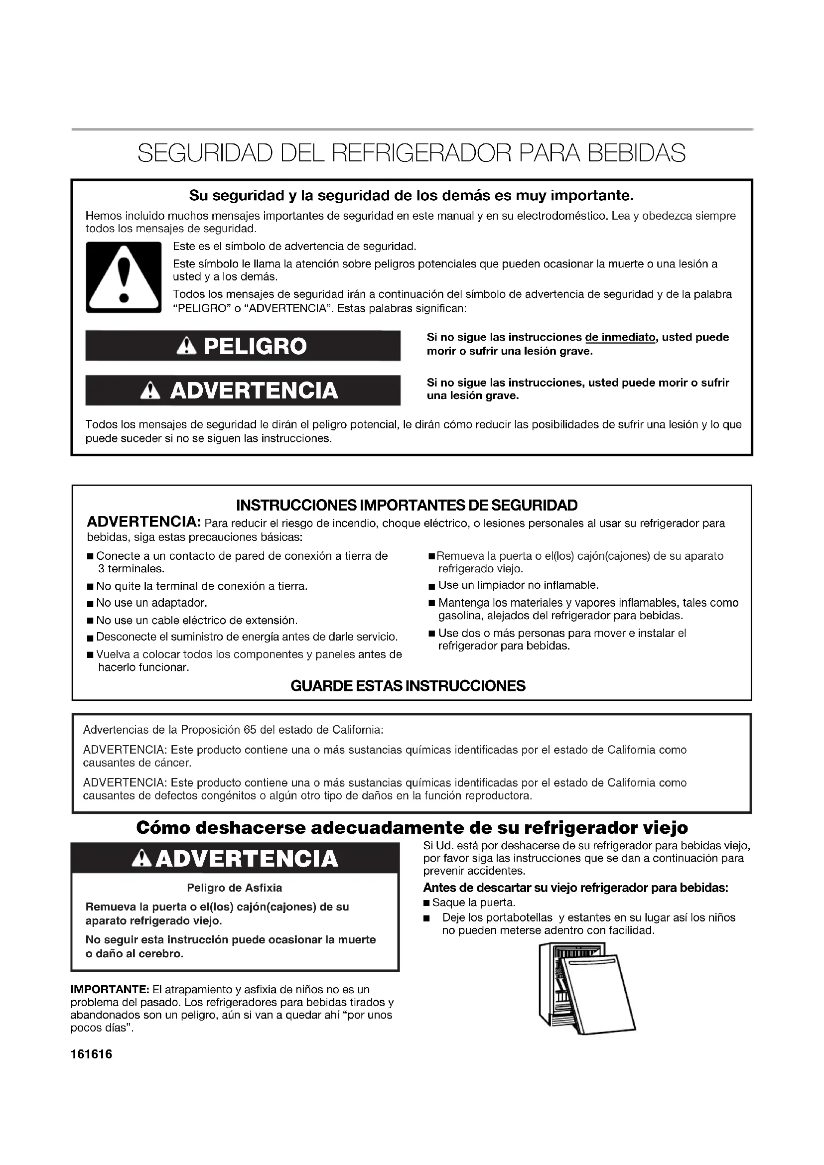 Cómo deshacerse adecuadamente de su refrigerador viejo IMPORTANTE: El atrapamiento y asfixia de niños no es un problema del pasado. Los refrigeradores para bebidas tirados y abandonados son un peligro, aún si van a quedar ahí “por unos pocos días”. Si Ud. está por deshacerse de su refrigerador para bebidas viejo, por favor siga las instrucciones que se dan a continuación para prevenir accidentes. Antes de descartar su viejo refrigerador para bebidas: ■ Saque la puerta. ■ Deje los portabotellas y estantes en su lugar así los niños no pueden meterse adentro con facilidad. Si no sigue las instrucciones de inmediato, usted puede morir o sufrir una lesión grave. Si no sigue las instrucciones, usted puede morir o sufrir una lesión grave. Todos los mensajes de seguridad le dirán el peligro potencial, le dirán cómo reducir las posibilidades de sufrir una lesión y lo que puede suceder si no se siguen las instrucciones. Su seguridad y la seguridad de los demás es muy importante. Hemos incluido muchos mensajes importantes de seguridad en este manual y en su electrodoméstico. Lea y obedezca siempre todos los mensajes de seguridad. ADVERTENCIA PELIGRO Este es el símbolo de advertencia de seguridad.Este símbolo le llama la atención sobre peligros potenciales que pueden ocasionar la muerte o una lesión a usted y a los demás.Todos los mensajes de seguridad irán a continuación del símbolo de advertencia de seguridad y de la palabra “PELIGRO” o “ADVERTENCIA”. Estas palabras significan: