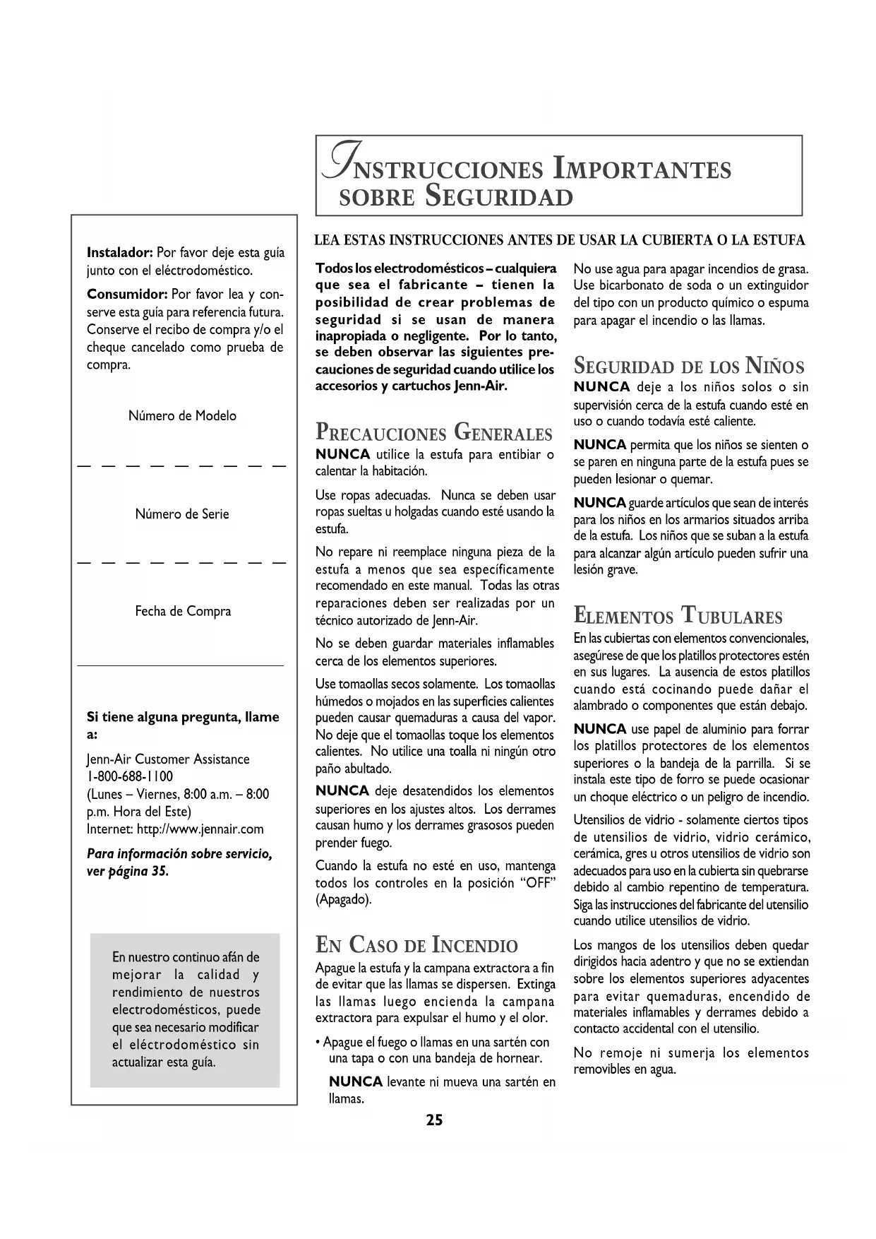 Instalador: Por favor deje esta guíajunto con el eléctrodoméstico.Consumidor: Por favor lea y con-serve esta guía para referencia futura.Conserve el recibo de compra y/o elcheque cancelado como prueba decompra.Número de Modelo Número de Serie Fecha de Compra_______________________________Si tiene alguna pregunta, llame Jenn-Air Customer Assistance1-800-688-1100(Lunes – Viernes, 8:00 a.m. – 8:00p.m. Hora del Este)Internet: http://www.jennair.comPara información sobre servicio,ver página 35.En nuestro continuo afán demejorar la calidad yrendimiento de nuestroselectrodomésticos, puedeque sea necesario modificarel eléctrodoméstico sinactualizar esta guía.Todos los electrodomésticos – cualquieraque sea el fabricante – tienen laposibilidad de crear problemas deseguridad si se usan de manerainapropiada o negligente. Por lo tanto,se deben observar las siguientes pre-cauciones de seguridad cuando utilice losaccesorios y cartuchos Jenn-Air.