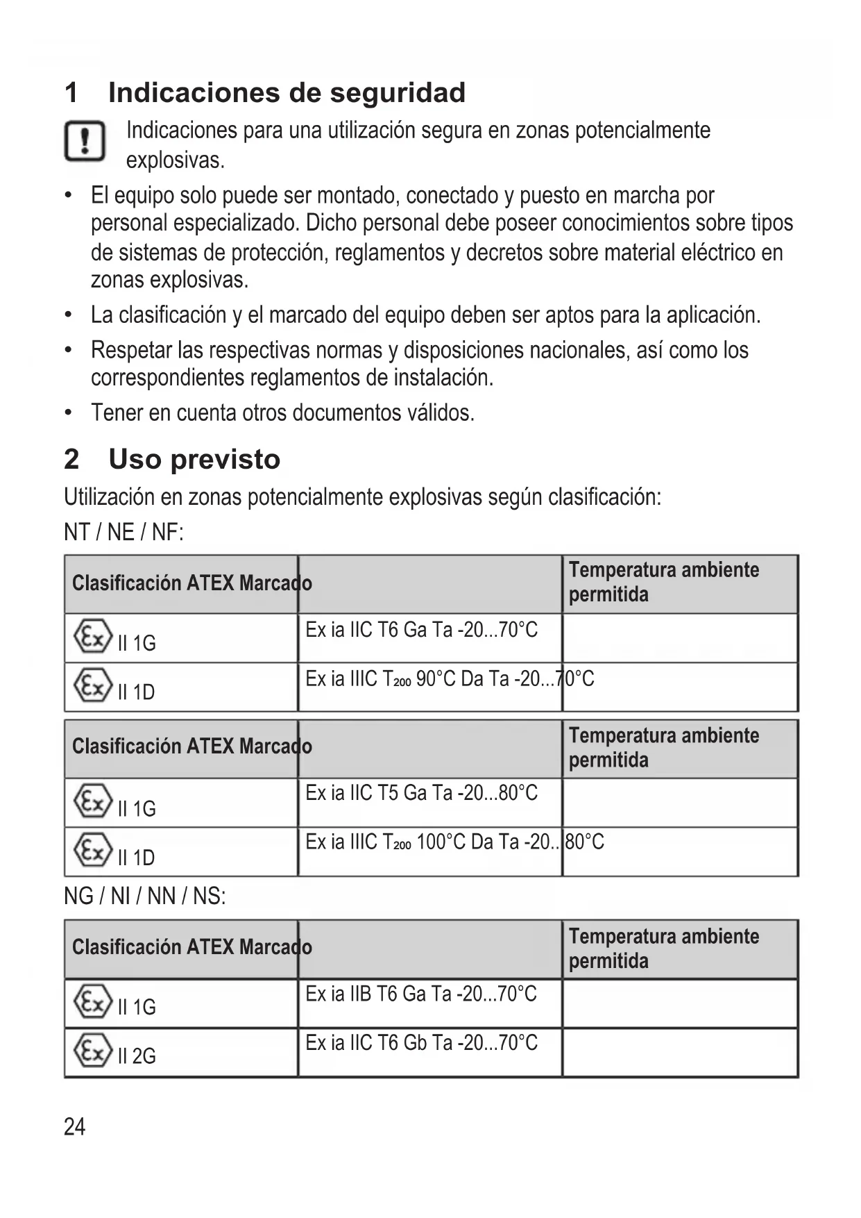 - Tener en cuenta otros documentos válidos. 2 Uso previsto Utilización en zonas potencialmente explosivas según clasificación: NT / NE / NF: Clasificación ATEX Marcado Temperatura ambiente permitida II 1G Ex ia IIC T6 Ga Ta -20 p. 70