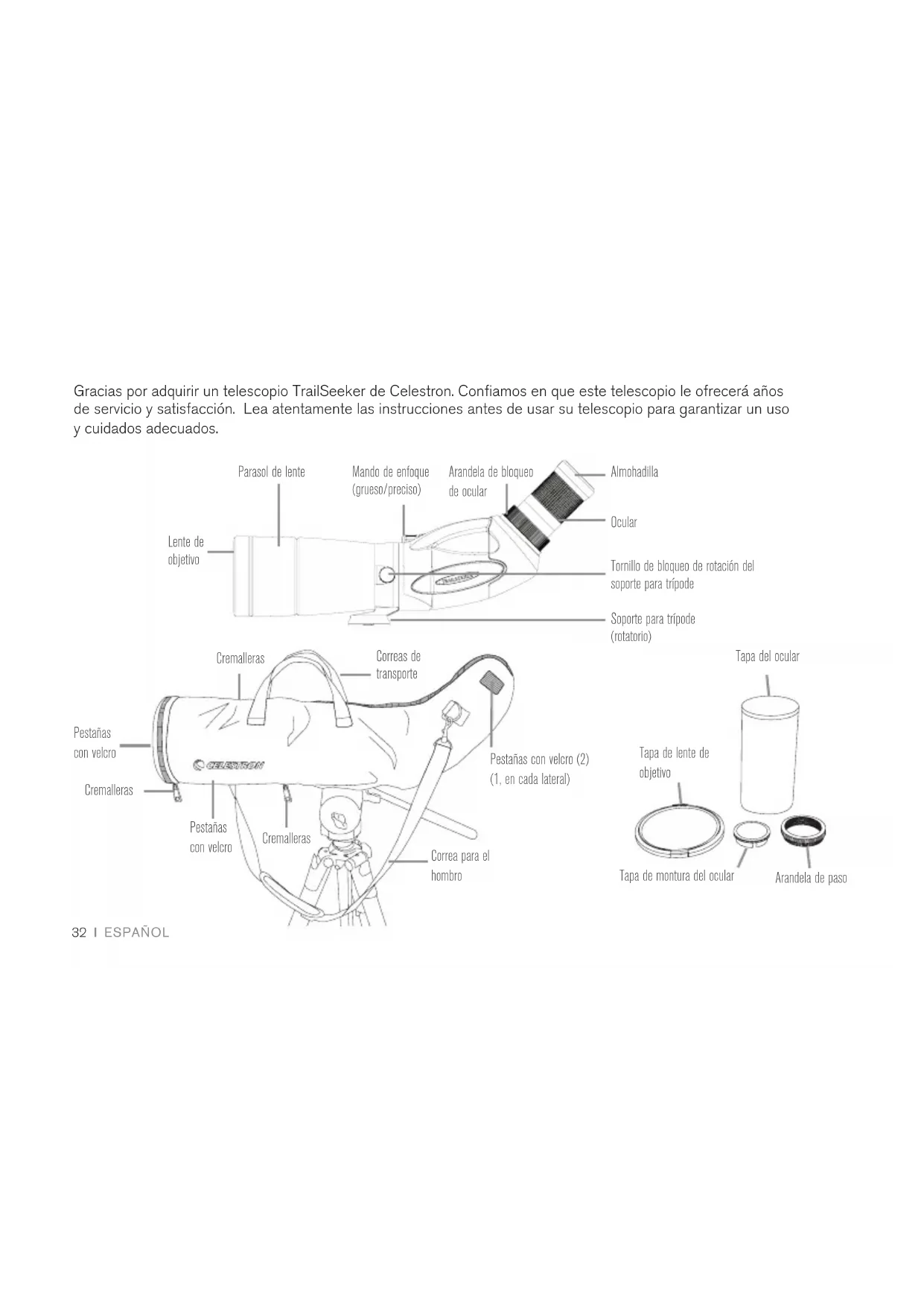 Gracias por adquirir un telescopio TrailSeeker de Celestron. Confiamos en que este telescopio le ofrecerá años de servicio y satisfacción. Lea atentamente las instrucciones antes de usar su telescopio para garantizar un uso y cuidados adecuados. Tapa de lente de objetivo Tapa de montura del ocular Arandela de paso Tapa del ocular Correas de transporte Pestañas con velcro (2) (1, en cada lateral) Correa para el hombro Cremalleras Cremalleras Cremalleras Pestañas con velcro Pestañas con velcro Mando de enfoque (grueso/preciso) Arandela de bloqueo de ocular Lente de objetivo Parasol de lente Tornillo de bloqueo de rotación del soporte para trípode Soporte para trípode (rotatorio) Almohadilla OcularESPAÑOL I 33 Fig. 3b ATENCIÓN No mire nunca al sol cuando use el telescopio. Mirar al sol puede provocar daños permanentes a la vista.