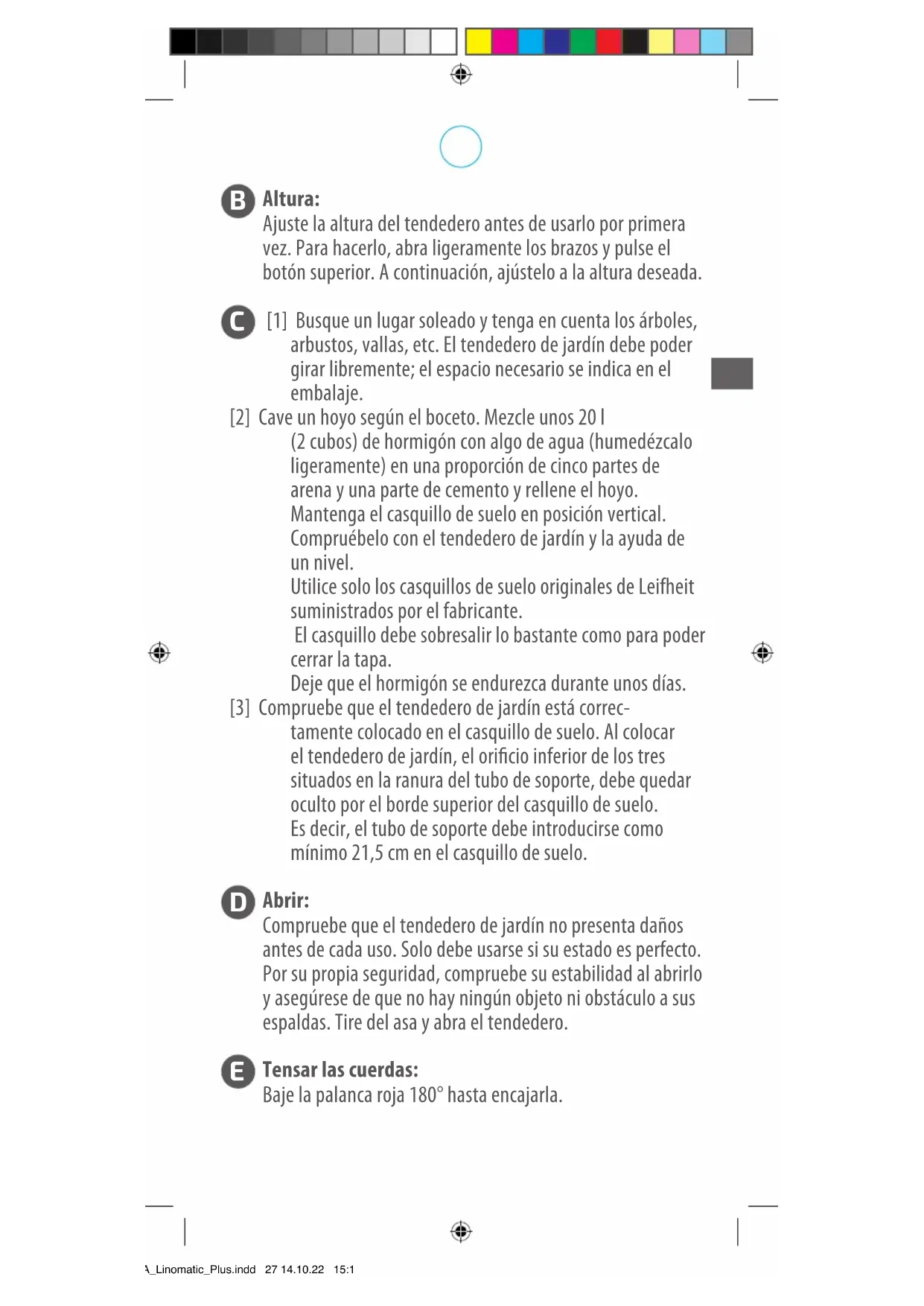Limpie de vez en cuando el pie con un paño húmedo y un producto de limpieza de uso doméstico. También puede aplicar una pequeña cantidad de aerosol protector sintético en un paño y pasarlo por el pie. Con el tendedero abierto, puede pulverizar un poco de aerosol protector en las aberturas de entrada de las cuerdas de los brazos. Retire regularmente la tierra, la arena y el agua acumuladas en el casquillo de suelo. Advertencias de seguridad: El tendedero de jardín Linomatic de Leifheit está diseñado para uso privado en exterior y debe usarse de acuerdo con las presentes instrucciones. No usar para nes distintos al previsto. Los niños podrían sufrir estrangulamiento al utilizar las cuerdas del tendedero. Para evitar estrangulamientos y que no se enreden las cuerdas, utilice el tendedero plegable fuera del alcance de los niños. Las cuerdas podrían enrollarse en el cuello de los niños. No ate entre sí las cuerdas. Asegúrese de que las cuerdas no se retuerzan y no formen nudos. *BA_Linomatic_Plus.indd 28 14.10.22 15:11Antes de cada uso, compruebe que el tendedero y la cuerda de elevación no presentan daños. Si el tendedero de jardín está dañado, no lo utilice. Si una cuerda se atasca entre las cubiertas de plástico, empújela hacia atrás con cuidado hasta alcanzar la apertura redonda de salida. No retire en ningún caso las cubiertas de plástico. Si una cuerda se enrolla en el tubo central, en un brazo o en la cubierta, abra un poco el tendedero de jardín y coloque la cuerda. Si las cuerdas están mojadas, abra el tendedero de jardín y deje que se sequen. Bedienungs-, Pege- und Sicherheitshinweise / Operating, care and safety instructions. / Instructions d’utilisation, instructions d‘entretien et consignes de sécurité / Bedienings-, verzorgings- en veiligheidsaanwijzingen / Istruzioni per l‘uso e il mantenimento e avvertenze di sicurezza / Instrucci- ones de uso, mantenimiento y seguridad / Pokyny pro obsluhu, ošetřování a bezpečnost / Pokyny na obsluhu, ošetrovanie a bezpečnostné pokyny / Wskazówki dotyczące obsługi, konserwacji i bezpieczeństwa / Bruks-, skötsel- och säkerhetsanvisningar / Bet- jenings-, pleje- og sikkerhedsanvisninger / Naudojimo, priežiūros ir saugos nurodyma / Kasutus- hooldus- ja ohutusjuhised