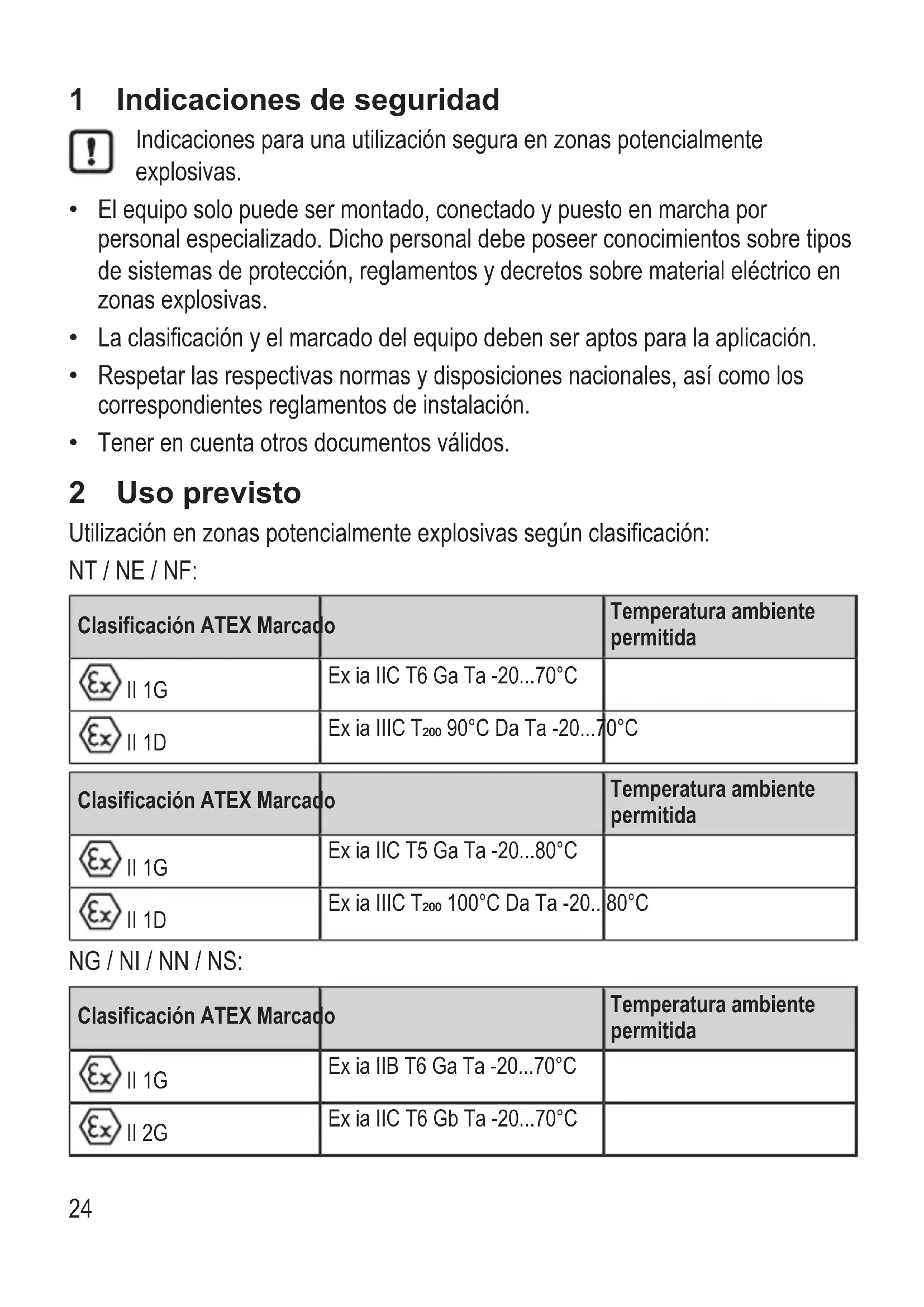 - Tener en cuenta otros documentos válidos. 2 Uso previsto Utilización en zonas potencialmente explosivas según clasificación: NT / NE / NF: Clasificación ATEX Marcado Temperatura ambiente permitida II 1G Ex ia IIC T6 Ga Ta -20 p. 70