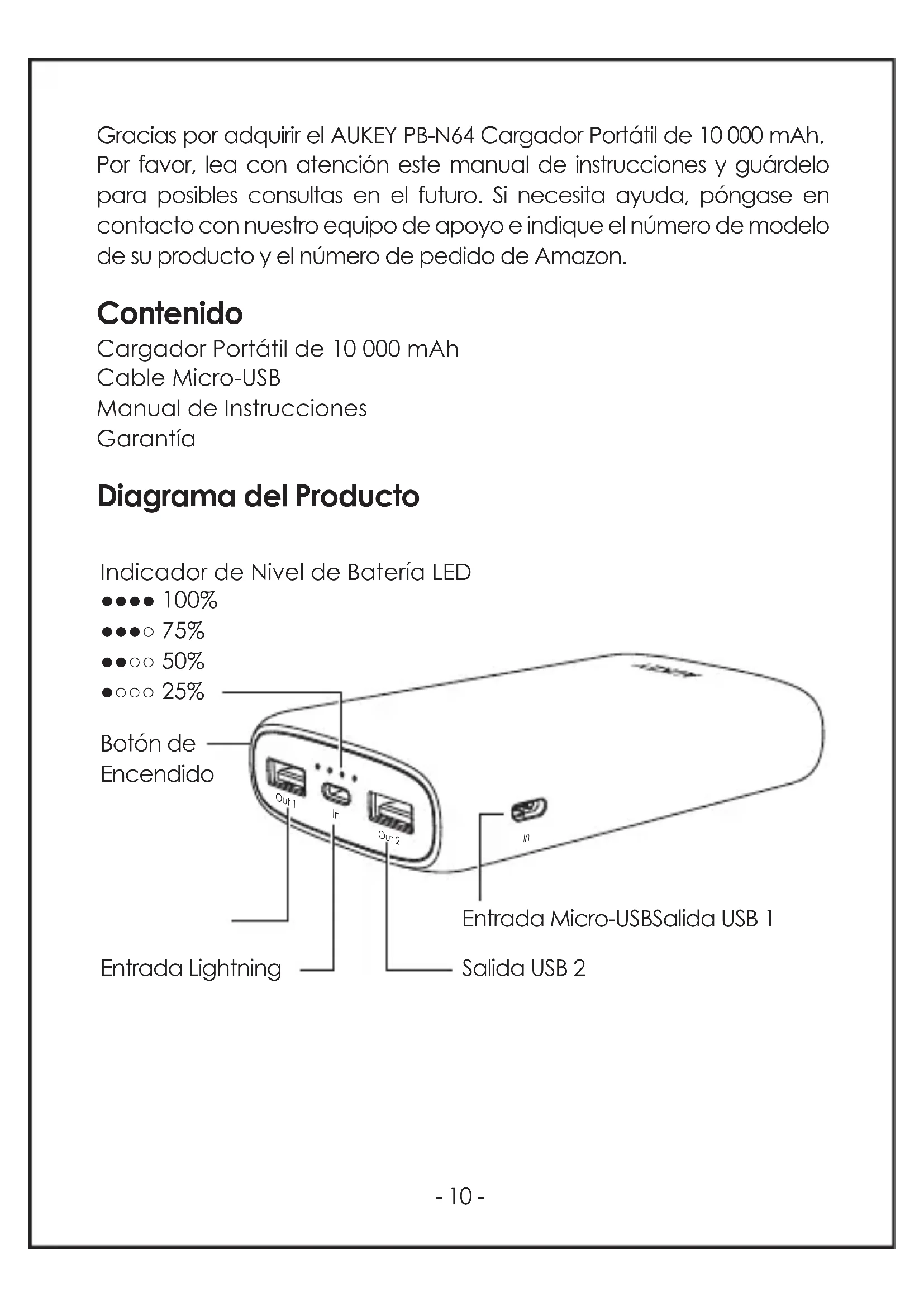 Botón de Encendido Entrada Micro-USBSalida USB 1 Salida USB 2 Indicador de Nivel de Batería LED ●●●● 100% ●●●○ 75% ●●○○ 50% ●○○○ 25% Entrada Lightning - 10 -- 11 - Especificaciones Modelo Tecnología Capacidad Tipo de Batería Entrada Lightning Entrada Micro-USB Salida USB 1/2 Dimensiones Peso PB-N64 AiPower 10000 mAh / 37 Wh Polímero de Litio DC 5 V 2 A DC 5 V 2 A 5 V 2,4 A (5 V 3,4 A en total) 107 x 69 x 24 mm 182 g Inicio Rápido Cargar el Cargador Cargue por completo el cargador portátil antes de usarlo por primera vez.