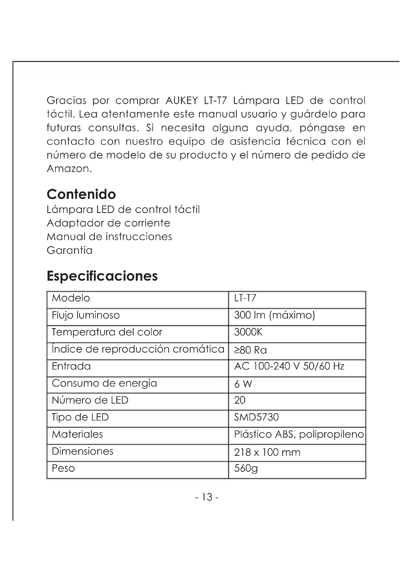 Gracias por comprar AUKEY LT-T7 Lámpara LED de control táctil. Lea atentamente este manual usuario y guardelo para futuras consultas. Si necesita algunaridge,pongase encontacto con nuestro equipo de asistencia技术水平 con el número de modelos de su producto y el número de pedido deAmazon.