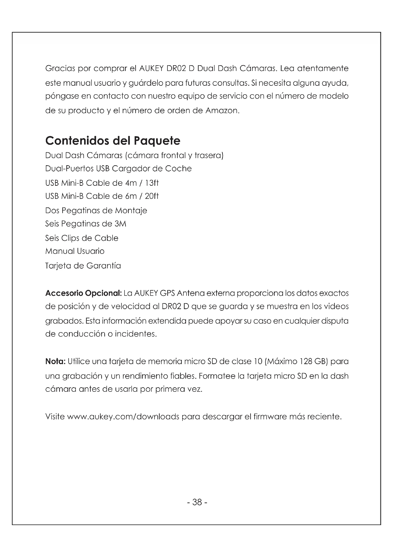 à rejouer. Supprimer /Verrouiller / Déverrouiller les Photos et Vidéos ● Appuyez sur pour effacer ou pour verrouiller / déverrouiller un fichier de photo ou fichier vidéo après l’avoir sélectionné dans la liste de lecture. Si une vidéo est en cours de jouer, appuyez sur pour l’arrêter, puis appuyez sur pour la supprimer ou pour verrouiller / déverrouiller ● Une fois être supprimées, les photos et les vidéos ne peuvent pas être récupérées ● Si vous verrouillez une photo ou une vidéo, elle sera protégée et non écrasée Entretien & Utilisation du Produit ● Assurez-vous que la caméra et le support sont solidement fixés sur place avant l'utilisation pour éviter les chutes ● Veuillez le tenir loin des liquides, de la chaleur extrême et des endroits avec des champs fort magnétiques ● Veuillez assurer que la température de travail est dans la gamme: -30°C - 75°C (-22°F - 167°F) ● Évitez de toucher la surface de l’objectif. Il faut un coton-tige ou un papier pour nettoyer la lentille. S’il y a une saleté est difficile à enlever, un nettoyant non-abrasif pour verres peut être utilisé. Ne pas utiliser des produits corrosifs- 37 - Garantie & Service Client Pour des questions, l'assistance, le soutien et les demandes de garanties, veuillez nous contacter à l'adresse ci-dessous qui correspond à votre région. Veuillez inclure le numéro de commande Amazon et le numéro de modèle du produit. Amazon EU commandes: support.eu@aukey.com *Veuillez noter que, AUKEY ne peut fournir le service après-vente que pour les produits achetés directement chez AUKEY. Si vous avez acheté auprès d'un vendeur différent, veuillez le contacter pour tous services et garanties.- 38 - Gracias por comprar el AUKEY DR02 D Dual Dash Cámaras. Lea atentamente este manual usuario y guárdelo para futuras consultas. Si necesita alguna ayuda, póngase en contacto con nuestro equipo de servicio con el número de modelo de su producto y el número de orden de Amazon. Contenidos del Paquete Dual Dash Cámaras (cámara frontal y trasera) Dual-Puertos USB Cargador de Coche USB Mini-B Cable de 4m / 13ft USB Mini-B Cable de 6m / 20ft Dos Pegatinas de Montaje Seis Pegatinas de 3M Seis Clips de Cable Manual Usuario Tarjeta de Garantía Accesorio Opcional: La AUKEY GPS Antena externa proporciona los datos exactos de posición y de velocidad al DR02 D que se guarda y se muestra en los videos grabados. Esta información extendida puede apoyar su caso en cualquier disputa de conducción o incidentes. Nota: Utilice una tarjeta de memoria micro SD de clase 10 (Máximo 128 GB) para una grabación y un rendimiento fiables. Formatee la tarjeta micro SD en la dash cámara antes de usarla por primera vez. Visite www.aukey.com/downloads para descargar el firmware más reciente.- 39 - Diagrama del Producto Cámara Frontal USB Mini-B Entrada de Alimentación Entrada GPS Entrada USB Mini-B AV Clip de Bloqueo de Montaje Lente Micrófono Indicador LED de Estado Exterior Botón de Reinicio Ranura para Tarjeta Micro SD- 40 - Salida de USB Mini-B AV LED Indicador de Estado Exterior Lente Clip de Bloqueo de Montaje Cámara Trasera 1080P+1080P 00:01:14 2049/08/13 22:15:06 Pantalla Botones de Control Indicador LED de Estado Interno Indicador de Pantalla- 41 - Especificaciones Modelo Sensor de Imagen CPU Pantalla Punto de Vista Abertura Valor de Exposición Recording Resolutions Formato de Imagen Grabación de Sonido Modos de Grabación Sensibilidad del Sensor de Gravedad Tarjeta Micro SD Entrada Temperatura de Funcionamiento Materiales Dimensiones DR02 D Sony Exmor IMX323 CMOS Sensor de 2,3 megapíxeles NT96663 1,5” LCD Cámara frontal: 170° Cámara trasera: 152° Cámara frontal : f/1.8 Cámara traser: f/2.0 -1.0, -2/3, -1/3, +0.0, +1/3, +2/3, +1.0 Dual Cámaras: 1080p (30fps) Sólo cámara frontal: 1080p (30fps), 720p (60fps), 720p (30fps), WVGA, VGA JPEG Encendido / Apagado Bucle, Detección de Movimiento, Tiempo Transcurrido y Grabación de Emergencia Sensibilidad Baja / Media / Alta Clase 10 o Superior, 128GB Máximo DC 5V 1A-2A -30°C – 75°C (-22°F – 167°F) ABS, PC, Vaso Cámara frontal: 77 x 51 x 37mm / 3 "x 2" x 1,45 " Cámara trasera: 54 x 50 x 28mm / 2,1" x 2" x 1,1"- 40 - Salida de USB Mini-B AV LED Indicador de Estado Exterior Lente Clip de Bloqueo de Montaje Cámara Trasera 1080P+1080P 00:01:14 2049/08/13 22:15:06 Pantalla Botones de Control Indicador LED de Estado Interno Indicador de Pantalla- 42 - LED Indicadores del Sistema Hay cuatro indicadores en total. Cada unidad de cámara tiene un indicador LED que orienta hacia la afuera (para que otros sepan que tiene cámaras activas). La cámara delantera tiene un indicador LED que orienta hacia el dentro y un indicador en la pantalla (ambos para su referencia). Los LED indicadores que orienta hacia afuera de las ambas cámaras se pueden apagar si desea que el sistema de la cámara de trazos sea menos visible para las personas exteriores. Vaya a Setup> Detect Led> seleccione Off> pulse OK. Indicadores LED Exteriores de Estado Verde Solido Verde Intermitente Indicadores LED Interno de Estado Verde Solido Verde Intermitente Indicador de la Pantalla Apagado Rojo Intermitente Sentido Encendido; Sin grabar Encendido; grabando Nota: En el modo de detección de movimiento, sólo el indicador LED interno estará encendido en el modo de espera. Una vez que se esté detectado el movimiento, todos los indicadores operarán igual que la grabación normal. Botón Modo de Grabación Entrar en modo de grabación emergencia Ver lista de reproducción (pulse brevemente) Activar / desactivar la grabación de audio (pulse largamente) Lista de Reproducción & Menú de Configuración Volver al menú anterior Mover hacia arriba Modo de Reproducción Volver a la lista de reproducción / Stop Eliminar / Retroceder Botones de Control- 43 - Nota: Se existe una pausa breve para guardar la grabación actual antes de entrar en la lista de reproducir o la co