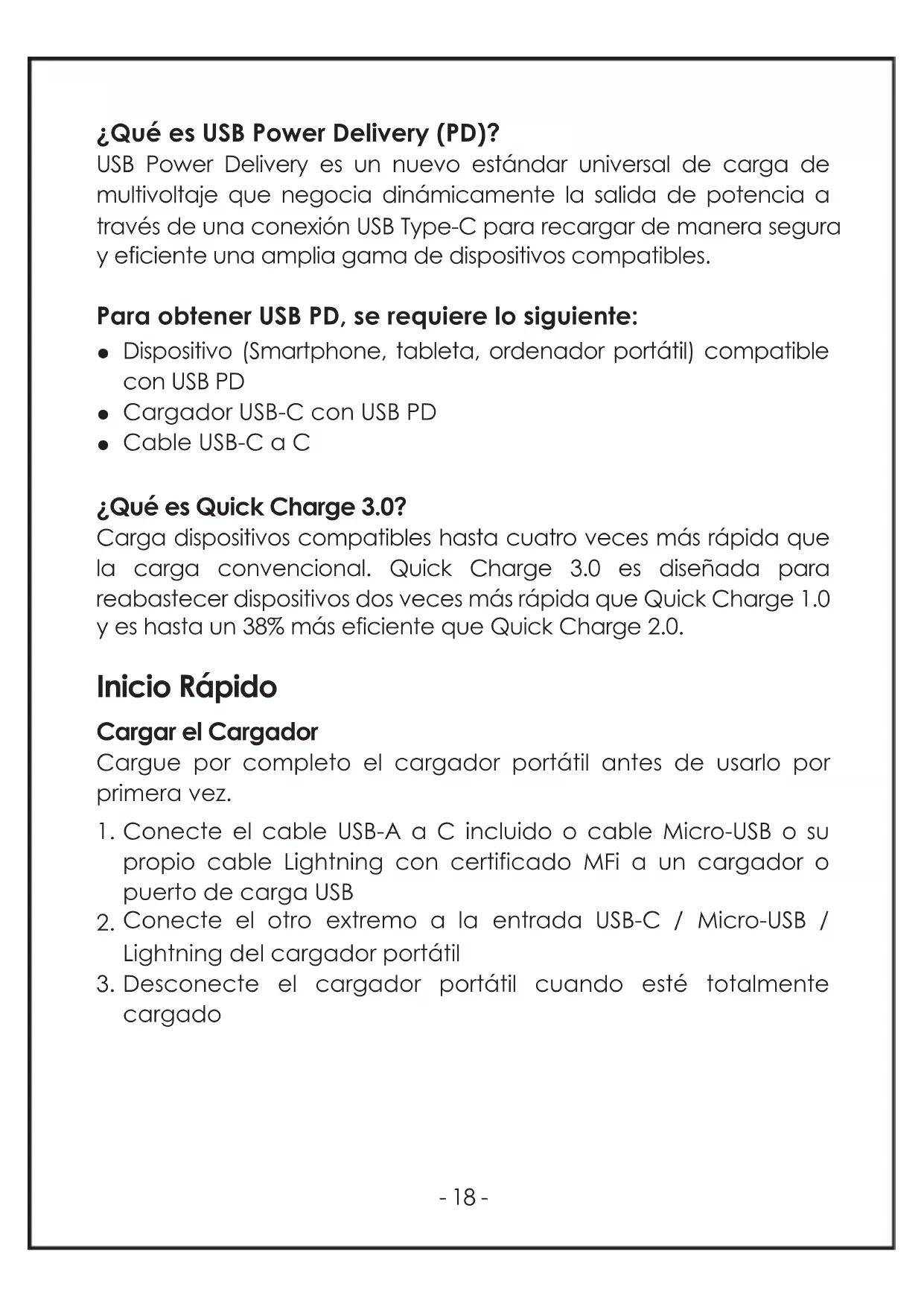 ¿Qué es Quick Charge 3.0? Carga dispositivos compatibles hasta cuatro veces más rápida que la carga convencional. Quick Charge 3.0 es diseñada para reabastecer dispositivos dos veces más rápida que Quick Charge 1.0 y es hasta un 38% más eficiente que Quick Charge 2.0. Inicio Rápido Cargar el Cargador Cargue por completo el cargador portátil antes de usarlo por primera vez. ¿Qué es USB Power Delivery (PD)? USB Power Delivery es un nuevo estándar universal de carga de multivoltaje que negocia dinámicamente la salida de potencia a través de una conexión USB Type-C para recargar de manera segura y eficiente una amplia gama de dispositivos compatibles. Para obtener USB PD, se requiere lo siguiente: Dispositivo (Smartphone, tableta, ordenador portátil) compatible con USB PD Cargador USB-C con USB PD Cable USB-C a C Conecte el cable USB-A a C incluido o cable Micro-USB o su propio cable Lightning con certificado MFi a un cargador o puerto de carga USB Conecte el otro extremo a la entrada USB-C / Micro-USB / Lightning del cargador portátil Desconecte el cargador portátil cuando esté totalmente cargado