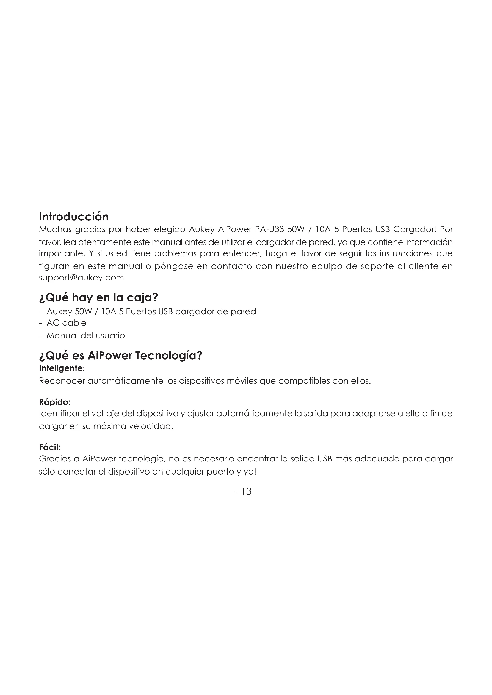 Muchas gratias por haber elegido Aukey AiPower PA-U33 50W / 10A 5 Puertoos USB Cargador! Por favor,lea atentamente este manual antes de utiliser el cargador de pared, ya que contiene informacion importante.Y siusted tiene problemas para tener, haga el favor de seguir las instrucciones que figuran en este manual opongase en contacto con nuestro equipo de soporte al cliente en support@aukey.com.