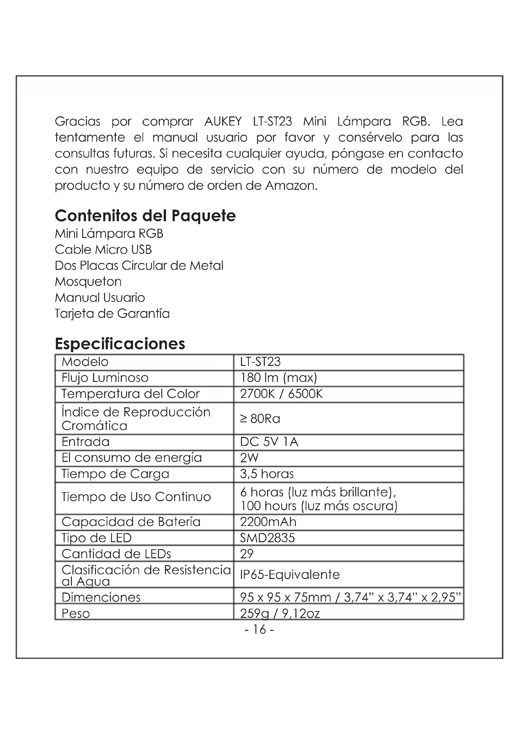 4.- 20 - Garantía & Soporte al Cliente Para las preguntas, los apoyos, o las reclamaciones de garantia, póngase en contacto con nosotros en las siguientes direcciones que corresponde con su región y incluya su número del orden de Amazon y el número de modelo del producto por favor. Amazon EU orders: support.eu@aukey.com *Por favor, tenga en cuenta que AUKEY sólo puede ofrecer servicio postventa a los productos comprados directamente de AUKEY. Si usted ha comprado del vendedor diferente, por favor, póngase en contacto con ellos directamente sobre la garantía o los problemas de servicio. Cuidado & Uso de Producto No reparar, eliminar o modificar el producto Mantener lejos del calor extremo Cuando se utiliza la correa colgante, garantizar una fijación segura para evitar la caida de luz Desconecte el cable de alimentación y apagar la luz antes de la limpieza o cuando no se utilice por un largo tiempo Limpiar la luz sólo con un paño suave y seco Cargar la LT-ST23 al menos una vez cada 3 meses