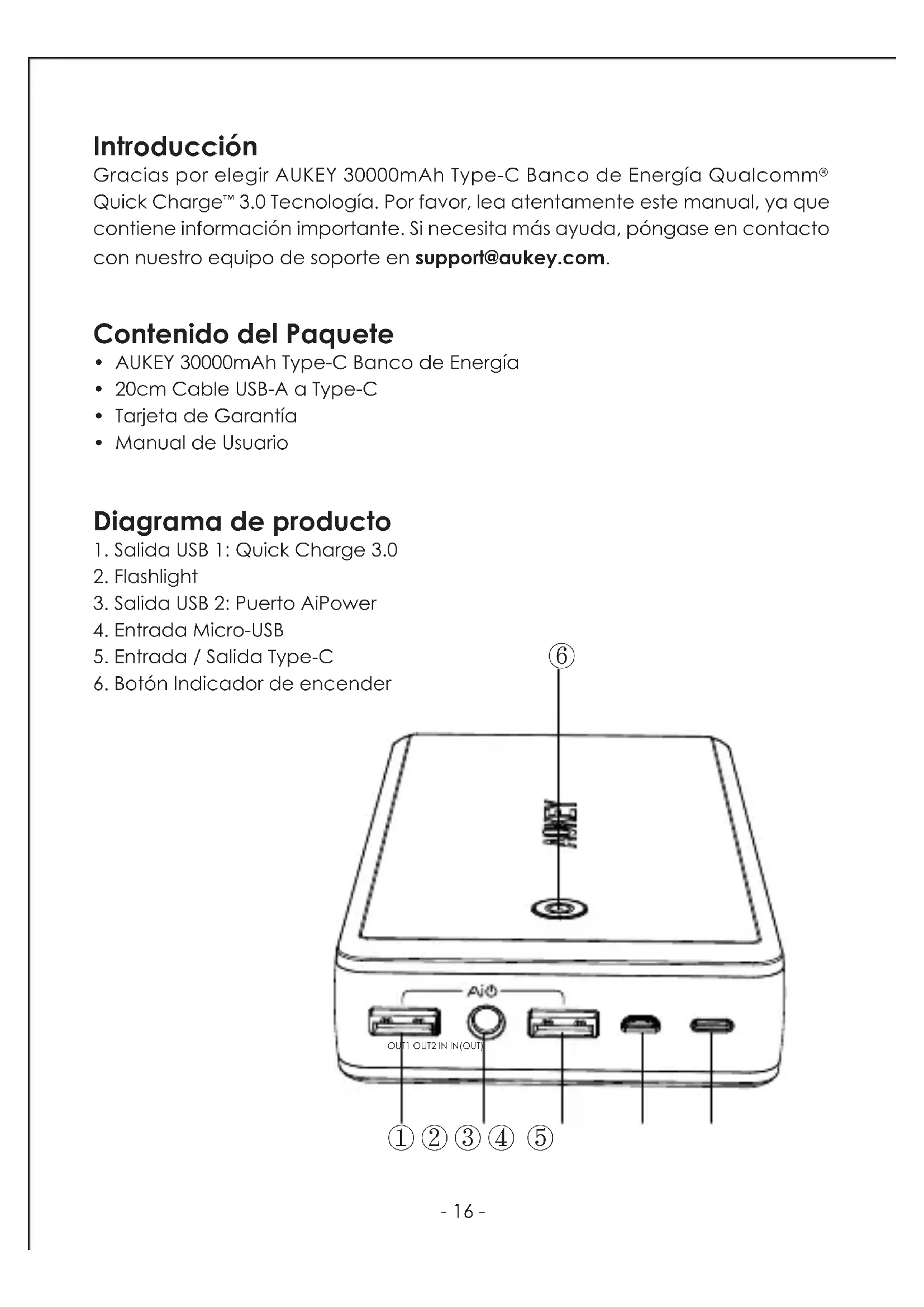 contiene información importante. Si necesita más ayuda, póngase en contacto con nuestro equipo de soporte en support@aukey.com. Contenido del Paquete