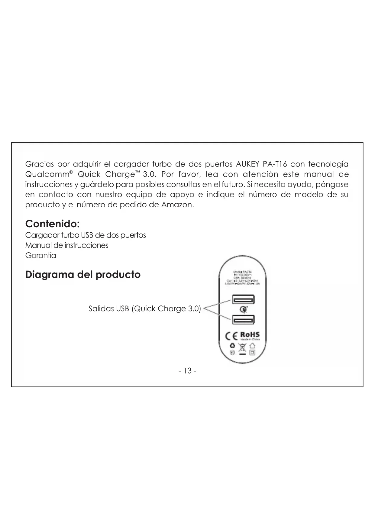 3.0. Por favor, lea con atención este manual de instrucciones y guárdelo para posibles consultas en el futuro. Si necesita ayuda, póngase en contacto con nuestro equipo de apoyo e indique el número de modelo de su producto y el número de pedido de Amazon. Contenido: Cargador turbo USB de dos puertos Manual de instrucciones Garantía Diagrama del producto