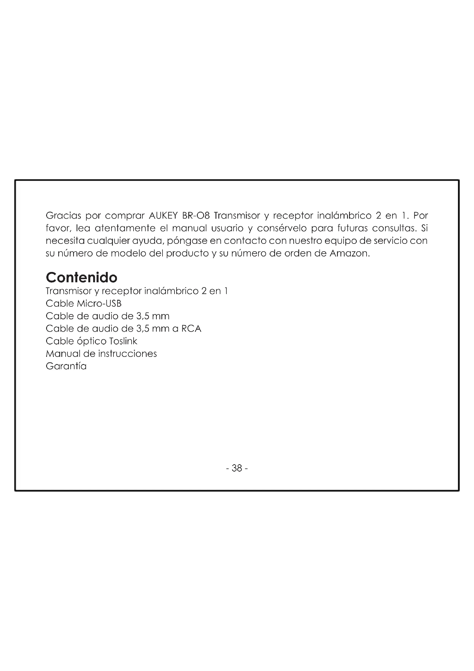 Indicadores de estado de conexión Parpadeo lento verde Parpadeo rápido verde Verde Parpadeo lento blanco Parpadeo rápido blanco blanco Mode Estado Sin conectar (en espera) Emparejamiento Conectado Sin conectar (en espera) Emparejamiento Conectado Modo transmisor Modo receptor Utilización y cuidados del producto Indicador- 49 - Garantía & Soporte al Cliente Para preguntas, apoyos o reclamaciones de garantía, por favor póngase en contacto con nosotros en la siguiente dirección que se corresponde con su región. Por favor, incluya su número de orden de Amazon y su número de modelo del producto. Amazon EU pedidos: support.eu@aukey.com *Por favor, tenga en cuenta que AUKEY sólo puede ofrecer servicio postventa a los productos comprados directamente de AUKEY. Si usted ha comprado del vendedor diferente, por favor, póngase en contacto con ellos directamente sobre la garantía o los problemas de servicio.- 50 - Grazie per acquistare l’AUKEY BR-O8 Trasmettitore e ricevitore wireless 2 in 1. Siprega di leggere attentamente il manuale d’uso e di conservarlo per unriferimento futuro. In caso di qualsiasi assistenza, si prega di contattare ilnostro gruppo di supporto, munito del numero di modello del Suo prodottoe del numero d’ordine di Amazon. La confezione include Trasmettitore e ricevitore wireless 2 in 1 Cavo Micro-USB Cavo audio da 3,5 mm Cavo audio da 3,5 mm a RCA Cavo ottico Toslink Manuale d’uso GaranziaModello Tecnologia Gamma di frequenza Ingresso Intervallo operativo Dimensioni Peso BR-O8 BT 5.0, aptX, aptX-LL 2.402GHz – 2.480GHz DC 5V 50m 113 x 110 x 73mm 300g