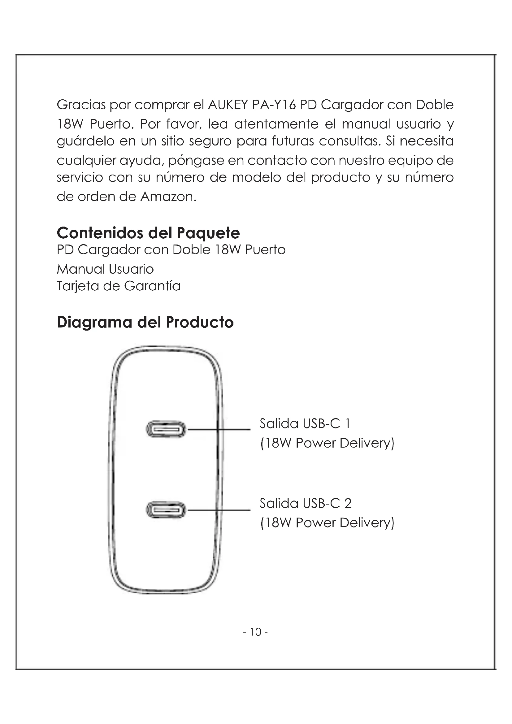 Remarque: L’iPhone X / 8 / 8 Plus prend en charge le chargement rapide s’il se charge avec le câble USB-C vers Lightning d’Apple d'origine Entretien du produit ● Tenir à l’écart des liquides et des sources de chaleur extrême Garantie et service client Pour toute question, assistance ou demande de garantie, veuillez nous contacter à l'adresse ci-dessous. Veuillez fournir votre numéro de commande Amazon ainsi que le numéro de modèle du produit. Commandes sur Amazon Europe: support.eu@aukey.com *Veuillez noter qu’AUKEY ne peut fournir le service après vente que pour les produits achetés directement via AUKEY. Si vous avez acheté votre produit via un vendeur différent, veuillez contacter directement ce vendeur pour les questions de maintenance et de garantie.- 10 - Gracias por comprar el AUKEY PA-Y16 PD Cargador con Doble 18W Puerto. Por favor, lea atentamente el manual usuario y guárdelo en un sitio seguro para futuras consultas. Si necesita cualquier ayuda, póngase en contacto con nuestro equipo de servicio con su número de modelo del producto y su número de orden de Amazon. Contenidos del Paquete PD Cargador con Doble 18W Puerto Manual Usuario Tarjeta de Garantía Diagrama del Producto Salida USB-C 1 (18W Power Delivery) Salida USB-C 2 (18W Power Delivery)- 11 - Especificaciones Nota: Este cargador soporta hasta 18W de salida de ambos puertos simultáneamente (36W en total) ¿Qué es USB Power Delivery? USB Power Delivery es un nuevo estándar universal de carga de multivoltaje que negocia dinámicamente la salida de potencia a través de una conexión USB Type-C para recargar de manera segura y eficiente una amplia gama de dispositivos compatibles. Para obtener USB PD, se requiere lo siguiente: Dispositivo (Smartphone, tableta, ordenador portátil) compati ble con USB PD Cargador USB-C con USB PD Cable USB-C a C Modelo Tecnología Entrada PA-Y16 Power Delivery 3.0 AC 100–240 V 64 x 63 x 29 mm / 2,52” x 2,48” x 1,14” 106 g / 3,74 oz Salida 1/2 Potencia de Salida Máxima Dimensiones Peso