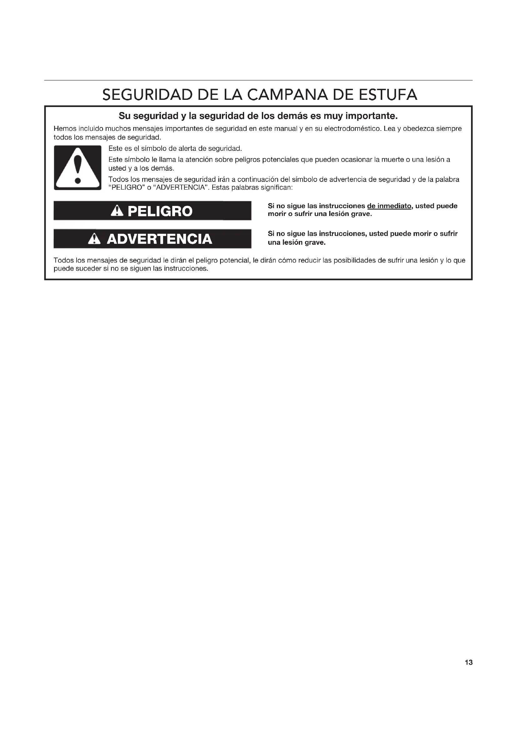 Si no sigue las instrucciones de inmediato, usted puede morir o sufrir una lesión grave. Si no sigue las instrucciones, usted puede morir o sufrir una lesión grave. Todos los mensajes de seguridad le dirán el peligro potencial, le dirán cómo reducir las posibilidades de sufrir una lesión y lo que puede suceder si no se siguen las instrucciones. Su seguridad y la seguridad de los demás es muy importante. Hemos incluido muchos mensajes importantes de seguridad en este manual y en su electrodoméstico. Lea y obedezca siempre todos los mensajes de seguridad. ADVERTENCIA PELIGRO Este es el símbolo de alerta de seguridad. Este símbolo le llama la atención sobre peligros potenciales que pueden ocasionar la muerte o una lesión a usted y a los demás. Todos los mensajes de seguridad irán a continuación del símbolo de advertencia de seguridad y de la palabra “PELIGRO” o “ADVERTENCIA”. Estas palabras significan:14