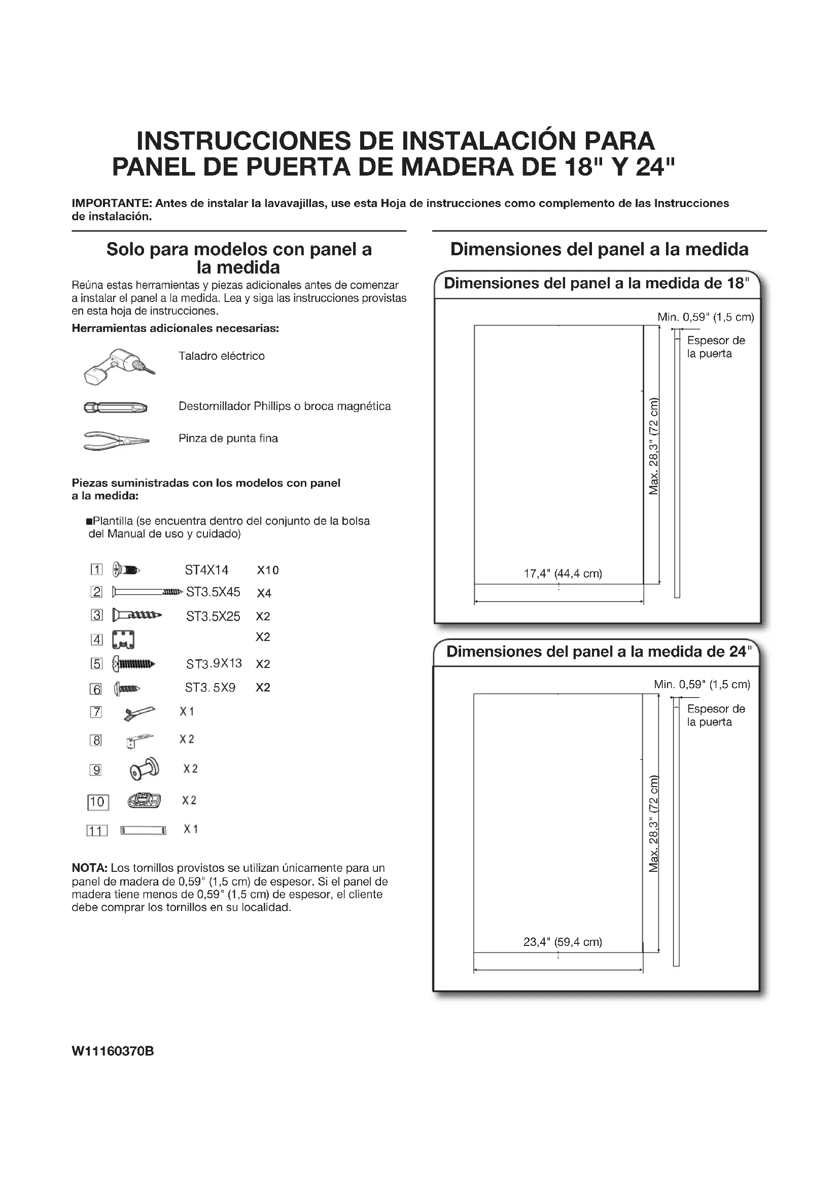 PANEL DE PUERTA DE MADERA DE 18" Y 24" IMPORTANTE: Antes de instalar la lavavajillas, use esta Hoja de instrucciones como complemento de las Instrucciones de instalación. Solo para modelos con panel a lamedida Reúna estas herramientas y piezas adicionales antes de comenzar a instalar el panel a la medida. Lea y siga las instrucciones provistas en esta hoja de instrucciones Herramientas adicionales necesarias:Taladro eléctricoDestornillador Phillips o broca magnéticaPinza de punta naPiezas suministradas con los modelos con panel a la medida: ■ Plantilla (se encuentra dentro del conjunto de la bolsadel Manual de uso y cuidado)NOTA: Los tornillos provistos se utilizan únicamente para un panel de madera de 0,59" (1,5cm) de espesor. Si el panel de madera tiene menos de 0,59" (1,5cm) de espesor, el cliente debe comprar los tornillos en su localidad. Dimensiones del panel a la medida Max. 28,3" (72 cm) 17,4" (44,4 cm)Min. 0,59" (1,5cm)Espesor de la puerta Dimensiones del panel a la medida de 18" Max. 28,3" (72 cm)23,4" (59,4 cm)Min. 0,59" (1,5cm)Espesor de la puerta Dimensiones del panel a la medida de 24" ST3.5X25