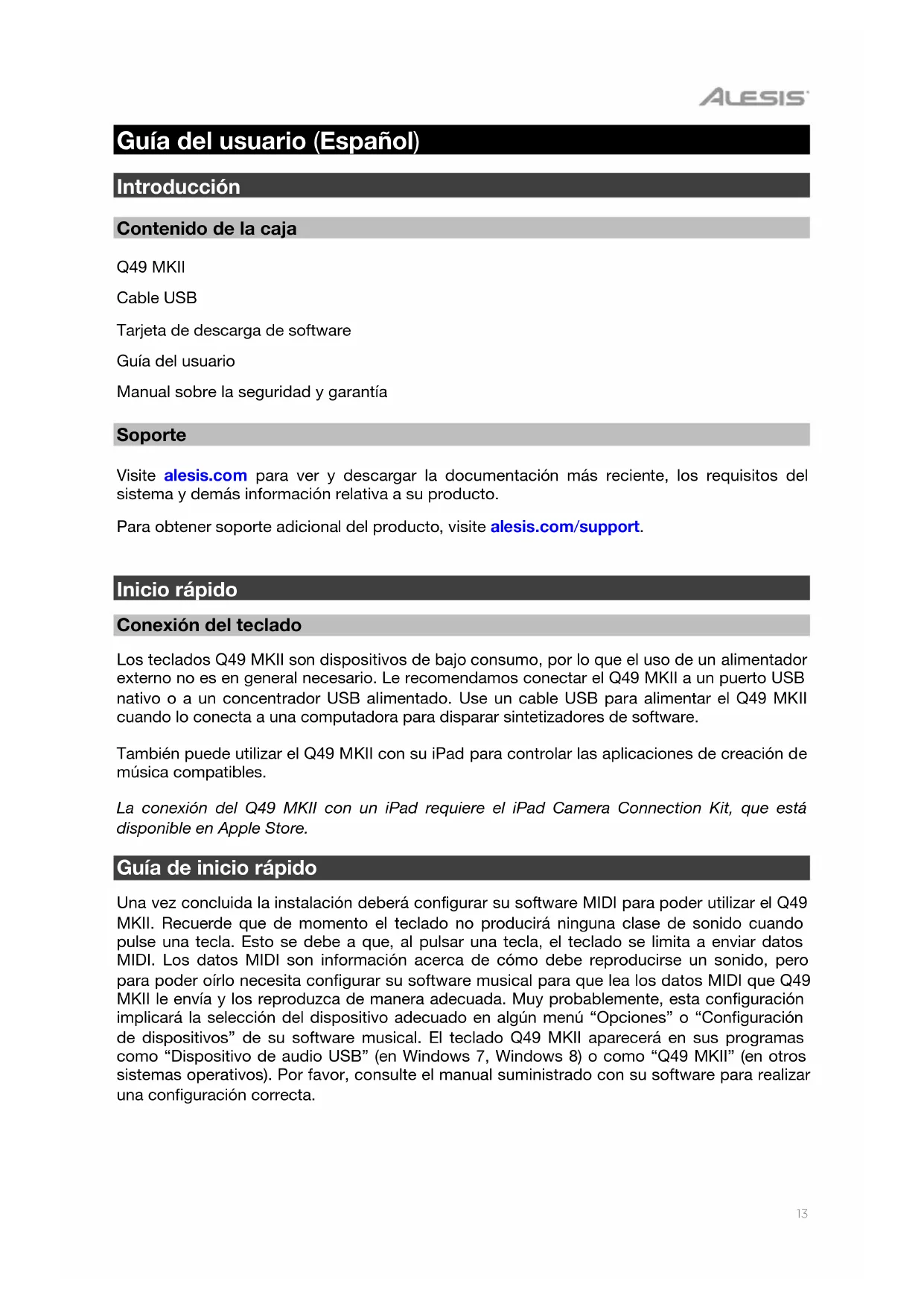 The Keyboard is now back to the factory default settings.13 Guía del usuario (Español) Introducción Contenido de la caja Q49 MKII Cable USB Tarjeta de descarga de software Guía del usuario Manual sobre la seguridad y garantía Soporte Visite alesis.com para ver y descargar la documentación más reciente, los requisitos del sistema y demás información relativa a su producto. Para obtener soporte adicional del producto, visite alesis.com/support.