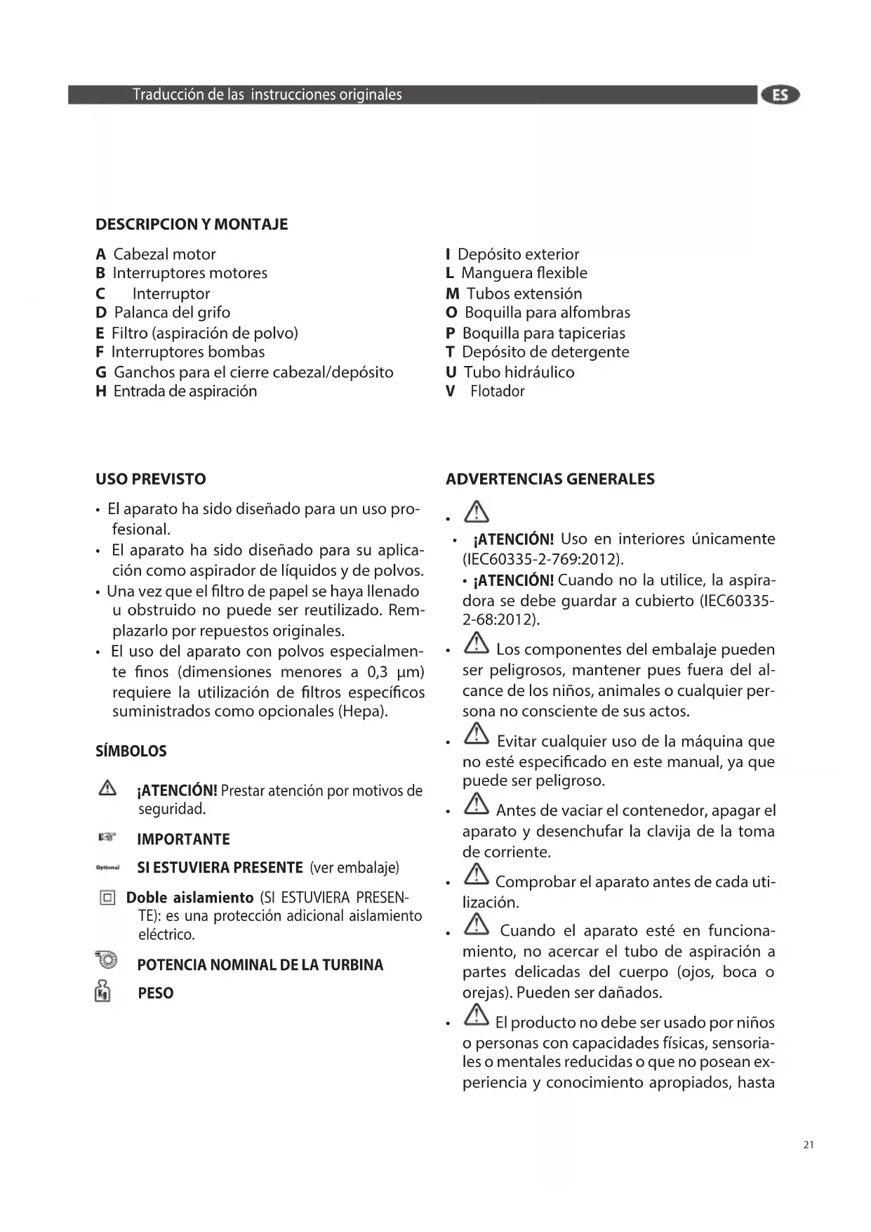 - El uso del aparato con polvos especialmen- te nos (dimensiones menores a 0,3 µm) requiere la utilización de ltros especícos suministrados como opcionales (Hepa). SÍMBOLOS ¡ATENCIÓN! Prestar atención por motivos de seguridad. IMPORTANTE SI ESTUVIERA PRESENTE (ver embalaje) Doble aislamiento (SI ESTUVIERA PRESEN- TE): es una protección adicional aislamiento eléctrico.