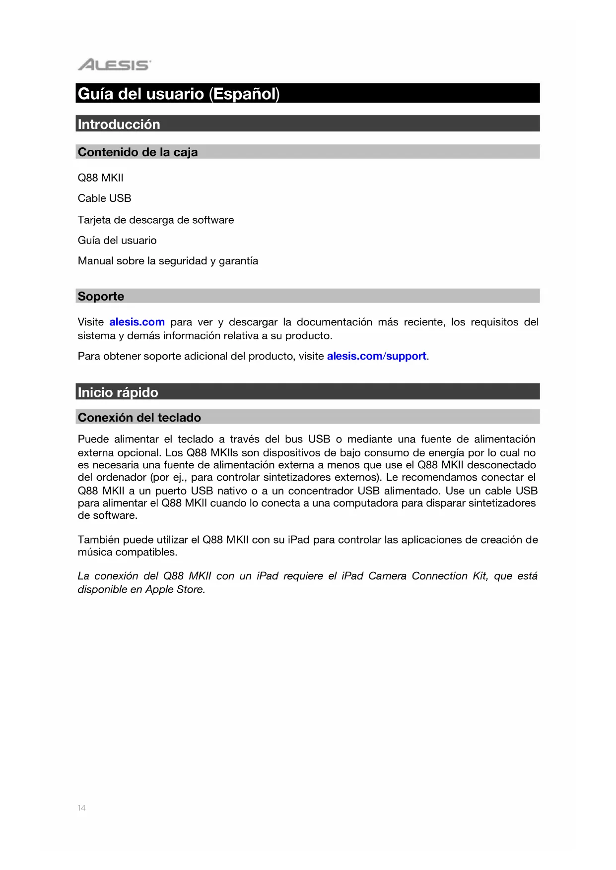 jack to whatever device is connected. In order to use the MIDI output, select the Q88 MKII USB MIDI Out as the MIDI output device in your sequencer.14 Guía del usuario (Español) Introducción Contenido de la caja Q88 MKII Cable USB Tarjeta de descarga de software Guía del usuario Manual sobre la seguridad y garantía Soporte Visite alesis.com para ver y descargar la documentación más reciente, los requisitos del sistema y demás información relativa a su producto. Para obtener soporte adicional del producto, visite alesis.com/support. Inicio rápido Conexión del teclado Puede alimentar el teclado a través del bus USB o mediante una fuente de alimentación externa opcional. Los Q88 MKIIs son dispositivos de bajo consumo de energía por lo cual no es necesaria una fuente de alimentación externa a menos que use el Q88 MKII desconectado del ordenador (por ej., para controlar sintetizadores externos). Le recomendamos conectar el Q88 MKII a un puerto USB nativo o a un concentrador USB alimentado. Use un cable USB para alimentar el Q88 MKII cuando lo conecta a una computadora para disparar sintetizadores de software.