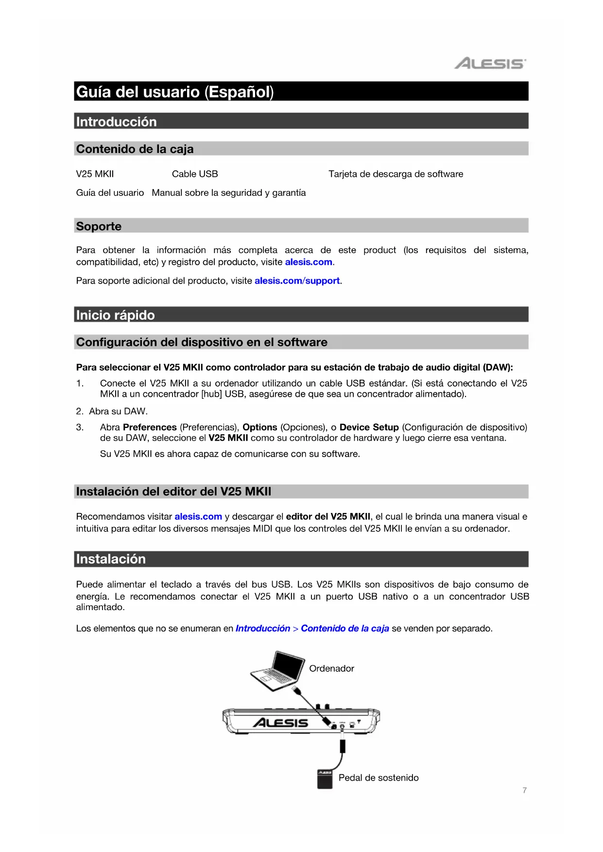 Lock Connector: This connector is compatible with standard laptop-style Kensington security cables for theft protection.7 Guía del usuario (Español) Introducción Contenido de la caja V25 MKII Cable USB Tarjeta de descarga de software Guía del usuario Manual sobre la seguridad y garantía Soporte Para obtener la información más completa acerca de este product (los requisitos del sistema, compatibilidad, etc) y registro del producto, visite alesis.com. Para soporte adicional del producto, visite alesis.com/support. Inicio rápido Configuración del dispositivo en el software Para seleccionar el V25 MKII como controlador para su estación de trabajo de audio digital (DAW):
