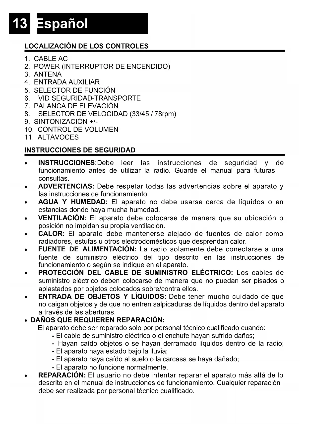 INSTRUCCIONES:Debe leer las instrucciones de seguridad y de funcionamiento antes de utilizar la radio. Guarde el manual para futuras consultas. ADVERTENCIAS: Debe respetar todas las advertencias sobre el aparato y las instrucciones de funcionamiento. AGUA Y HUMEDAD: El aparato no debe usarse cerca de líquidos o en estancias donde haya mucha humedad. VENTILACIÓN: El aparato debe colocarse de manera que su ubicación o posición no impidan su propia ventilación. CALOR: El aparato debe mantenerse alejado de fuentes de calor como radiadores, estufas u otros electrodomésticos que desprendan calor. FUENTE DE ALIMENTACIÓN: La radio solamente debe conectarse a una fuente de suministro eléctrico del tipo descrito en las instrucciones de funcionamiento o según se indique en el aparato. PROTECCIÓN DEL CABLE DE SUMINISTRO ELÉCTRICO: Los cables de suministro eléctrico deben colocarse de manera que no puedan ser pisados o aplastados por objetos colocados sobre/contra ellos. ENTRADA DE OBJETOS Y LÍQUIDOS: Debe tener mucho cuidado de que no caigan objetos y de que no entren salpicaduras de líquidos dentro del aparato a través de las aberturas. DAÑOS QUE REQUIEREN REPARACIÓN: El aparato debe ser reparado solo por personal técnico cualificado cuando: - El cable de suministro eléctrico o el enchufe hayan sufrido daños; - Hayan caído objetos o se hayan derramado líquidos dentro de la radio; - El aparato haya estado bajo la lluvia; - El aparato haya caído al suelo o la carcasa se haya dañado; - El aparato no funcione normalmente. REPARACIÓN: El usuario no debe intentar reparar el aparato más allá de lo descrito en el manual de instrucciones de funcionamiento. Cualquier reparación debe ser realizada por personal técnico cualificado.14 Español