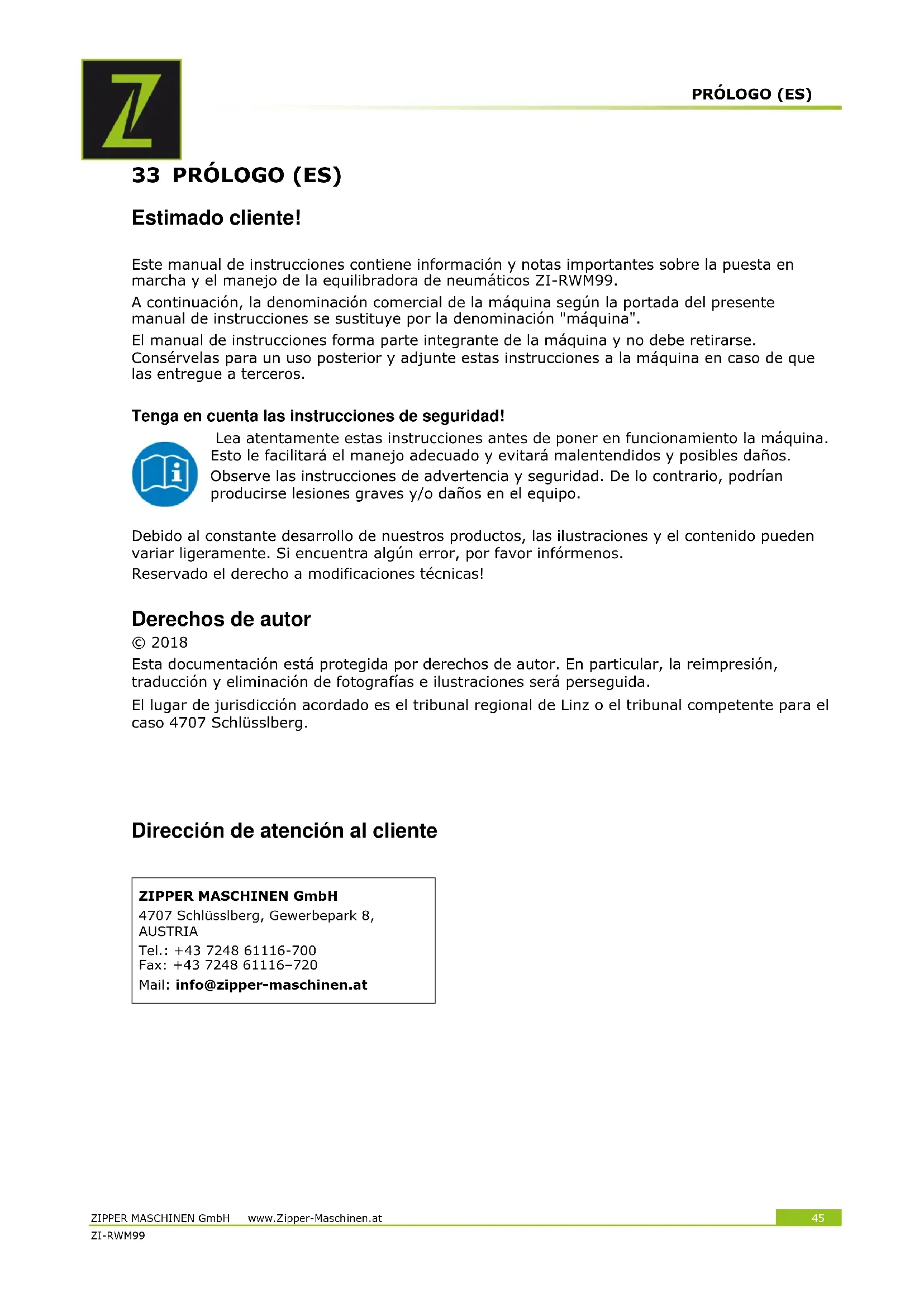 Utilice la máquina únicamente en un estado técnicamente perfecto y de acuerdo con el uso previsto, la seguridad y el conocimiento de los peligros. Compruebe la seguridad de funcionamiento de la máquina antes de cada uso. Eliminar inmediatamente los fallos que puedan afectar a la seguridad! Las etiquetas y/o pegatinas de advertencia de la máquina que sean ilegibles o que hayan sido retiradas deben ser sustituidas inmediatamente. Las leyes y regulaciones locales pueden determinar la edad mínima del operador y restringir el uso de esta máquina. Observe las medidas de funcionamiento, mantenimiento y reparación recomendadas y, sin excepción, respete las instrucciones de seguridad contenidas en las instrucciones de esta máquina. Además, observe las siguientes recomendaciones generales para un trabajo seguro: Sólo coloque la máquina sobre una superficie estable que no ceda el paso. Hacer funcionar la máquina sólo en condiciones de iluminación suficientemente buenas. Cuando trabaje, lleve siempre calzado sólido y antideslizante (calzado de seguridad S1) y, en caso necesario, otro equipo de protección personal adecuado (ropa de trabajo ajustada, guantes de protección según EN 388, clase 3111, gafas de seguridad o protección facial). No trabaje en la máquina si está cansado, desenfocado o bajo la influencia de medicamentos, alcohol o drogas. ¡No deje nunca la máquina en marcha desatendida! Si entrega la máquina a un tercero, es imprescindible que se adjunten las instrucciones de uso de la máquina. Para evitar fallos de funcionamiento, daños y efectos nocivos para la salud, deben observarse también las siguientes instrucciones de seguridad:PUESTA EN MARCHA ZIPPER MASCHINEN GmbH www.Zipper-Maschinen.at 47 ZI-RWM99