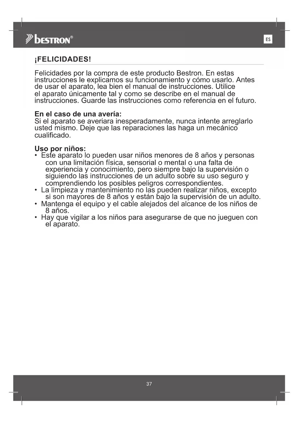 ¡FELICIDADES! Felicidades por la compra de este producto Bestron. En estas instrucciones le explicamos su funcionamiento y cómo usarlo. Antes de usar el aparato, lea bien el manual de instrucciones. Utilice el aparato únicamente tal y como se describe en el manual de instrucciones. Guarde las instrucciones como referencia en el futuro. En el caso de una avería: Si el aparato se averiara inesperadamente, nunca intente arreglarlo usted mismo. Deje que las reparaciones las haga un mecánico cualificado. Uso por niños: