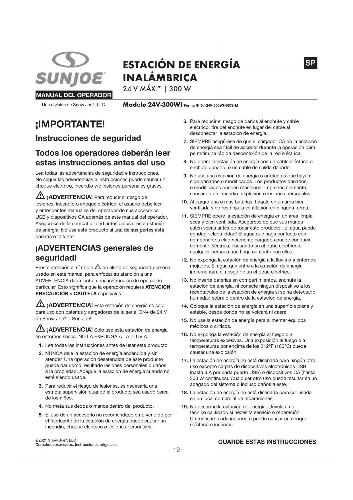 la estación de energía del tomacorriente y retire la batería o baterías antes de intentar cualquier tarea de servicio o reparación. Instrucciones de seguridad para las baterías y el cargador NOTA: la batería no está incluida y deberá ser adquirida por separado. El modelo 24V-300WI es compatible con las baterías del sistema iON+ de 24 V. Vea la página 33 para más información. Prestamos mucha atención al diseño de cada batería para garantizar la producción de baterías seguras y durables, con una alta densidad de energía. Las celdas de las baterías tienen varios dispositivos de seguridad. Cada celda individual es inicialmente formateada y sus curvas eléctricas características son registradas. Estos datos son luego usados exclusivamente para ensamblar las mejores baterías posibles. Independientemente de todas las precauciones de seguridad, se debe tener mucho cuidado al manipular las baterías. Las siguientes instrucciones deben ser obedecidas en todo momento para garantizar un uso seguro. Un uso seguro solo puede ser garantizado si se usan celdas libres de daños. Una manipulación incorrecta de las baterías puede causar daños en sus celdas. ¡IMPORTANTE! Los análisis han conrmado que el uso incorrecto y el cuidado deciente de baterías de alto rendimiento son las causas principales de lesiones personales y/o daños al producto. m ¡ADVERTENCIA! Use solo baterías de repuesto aprobadas. Otras baterías pueden dañar la estación de energía y provocar un desperfecto que pueda causar lesiones personales severas. m ¡ADVERTENCIA! No use baterías o artefactos que hayan sido dañados o modicados. Las baterías dañadas o modicadas pueden reaccionar impredeciblemente, causando un incendio, explosión o lesiones personales. No modique ni intente reparar el artefacto o la batería, a menos que lo haga según lo indicado en las instrucciones de uso y cuidado. Su batería deberá ser reparada por una persona calicada usando únicamente partes de repuesto originales. Esto mantendrá la seguridad de la batería. m ¡PRECAUCIÓN! Para reducir el riesgo de lesiones personales, cargue la batería de iones de litio de 24 V Sun Joe