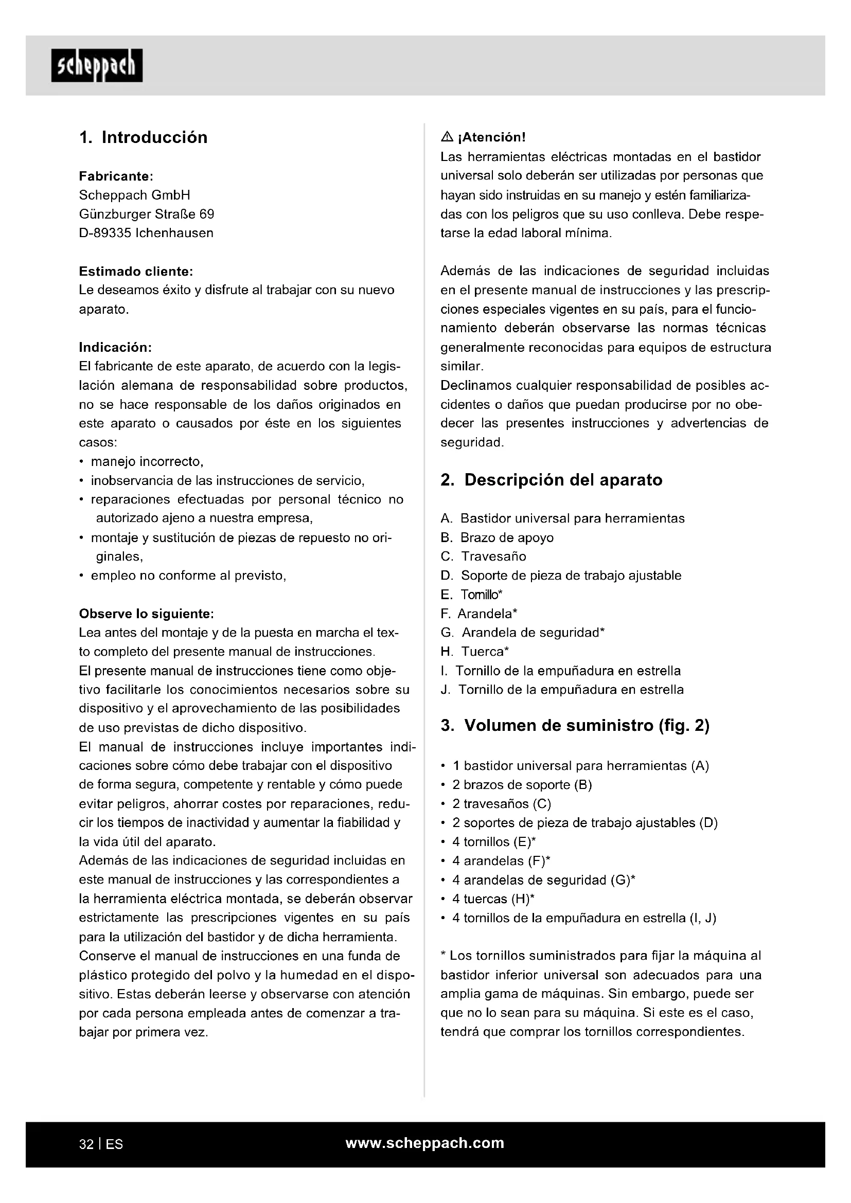 - empleo no conforme al previsto, Observe lo siguiente: Lea antes del montaje y de la puesta en marcha el tex- to completo del presente manual de instrucciones. El presente manual de instrucciones tiene como obje- tivo facilitarle los conocimientos necesarios sobre su dispositivo y el aprovechamiento de las posibilidades de uso previstas de dicho dispositivo. El manual de instrucciones incluye importantes indi- caciones sobre cómo debe trabajar con el dispositivo de forma segura, competente y rentable y cómo puede evitar peligros, ahorrar costes por reparaciones, redu- cir los tiempos de inactividad y aumentar la abilidad y la vida útil del aparato. Además de las indicaciones de seguridad incluidas en este manual de instrucciones y las correspondientes a la herramienta eléctrica montada, se deberán observar estrictamente las prescripciones vigentes en su país para la utilización del bastidor y de dicha herramienta. Conserve el manual de instrucciones en una funda de plástico protegido del polvo y la humedad en el dispo- sitivo. Estas deberán leerse y observarse con atención por cada persona empleada antes de comenzar a tra- bajar por primera vez.www.scheppach.com