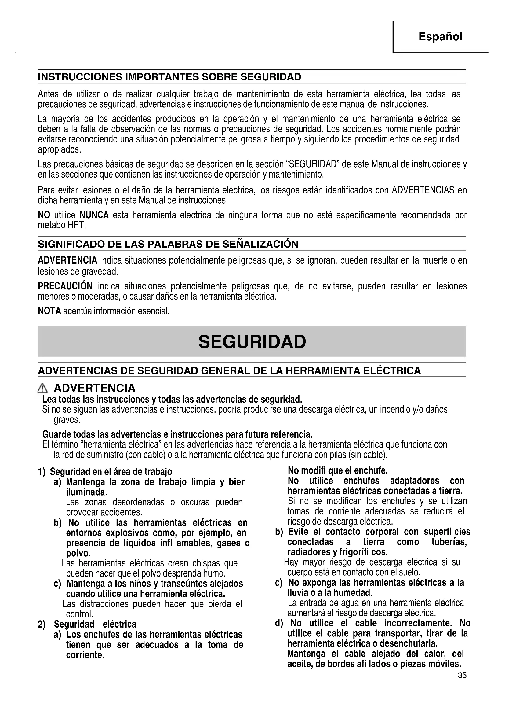 Antes de utilizar o de realizar cualquier trabajo de mantenimiento de esta herramienta eléctrica, lea todas las precauciones de seguridad, advertencias e instrucciones de funcionamiento de este manual de instrucciones. La mayoría de los accidentes producidos en la operación y el mantenimiento de una herramienta eléctrica se deben a la falta de observación de las normas o precauciones de seguridad. Los accidentes normalmente podrán evitarse reconociendo una situación potencialmente peligrosa a tiempo y siguiendo los procedimientos de seguridad apropiados. Las precauciones básicas de seguridad se describen en la sección “SEGURIDAD” de este Manual de instrucciones y en las secciones que contienen las instrucciones de operación y mantenimiento. Para evitar lesiones o el daño de la herramienta eléctrica, los riesgos están identifi cados con ADVERTENCIAS en dicha herramienta y en este Manual de instrucciones. NO utilice NUNCA esta herramienta eléctrica de ninguna forma que no esté específi camente recomendada por metabo HPT. SIGNIFICADO DE LAS PALABRAS DE SEÑALIZACIÓN ADVERTENCIA indica situaciones potencialmente peligrosas que, si se ignoran, pueden resultar en la muerte o en lesiones de gravedad. PRECAUCIÓN indica situaciones potencialmente peligrosas que, de no evitarse, pueden resultar en lesiones menores o moderadas, o causar daños en la herramienta eléctrica. NOTA acentúa información esencial. SEGURIDAD ADVERTENCIAS DE SEGURIDAD GENERAL DE LA HERRAMIENTA ELÉCTRICA ADVERTENCIA Lea todas las instrucciones y todas las advertencias de seguridad. Si no se siguen las advertencias e instrucciones, podría producirse una descarga eléctrica, un incendio y/o daños graves. Guarde todas las advertencias e instrucciones para futura referencia. El término “herramienta eléctrica” en las advertencias hace referencia a la herramienta eléctrica que funciona con la red de suministro (con cable) o a la herramienta eléctrica que funciona con pilas (sin cable).