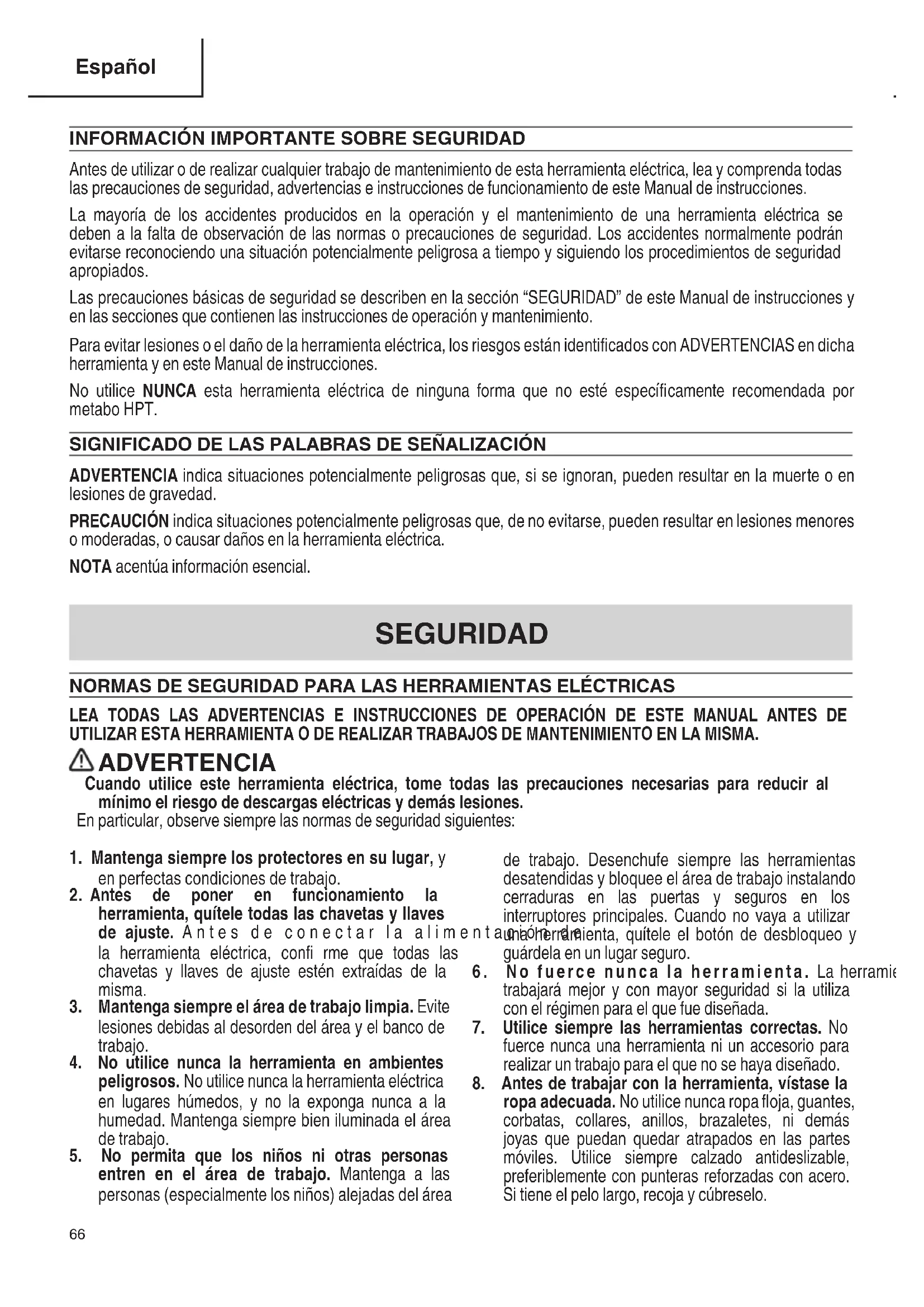 Para evaporar lesiones o el dano de la herramienta eletrica, los riesgos estan identificados con ADVERTENCIAS en dicha herramenta y en este Manual de instrucciones.