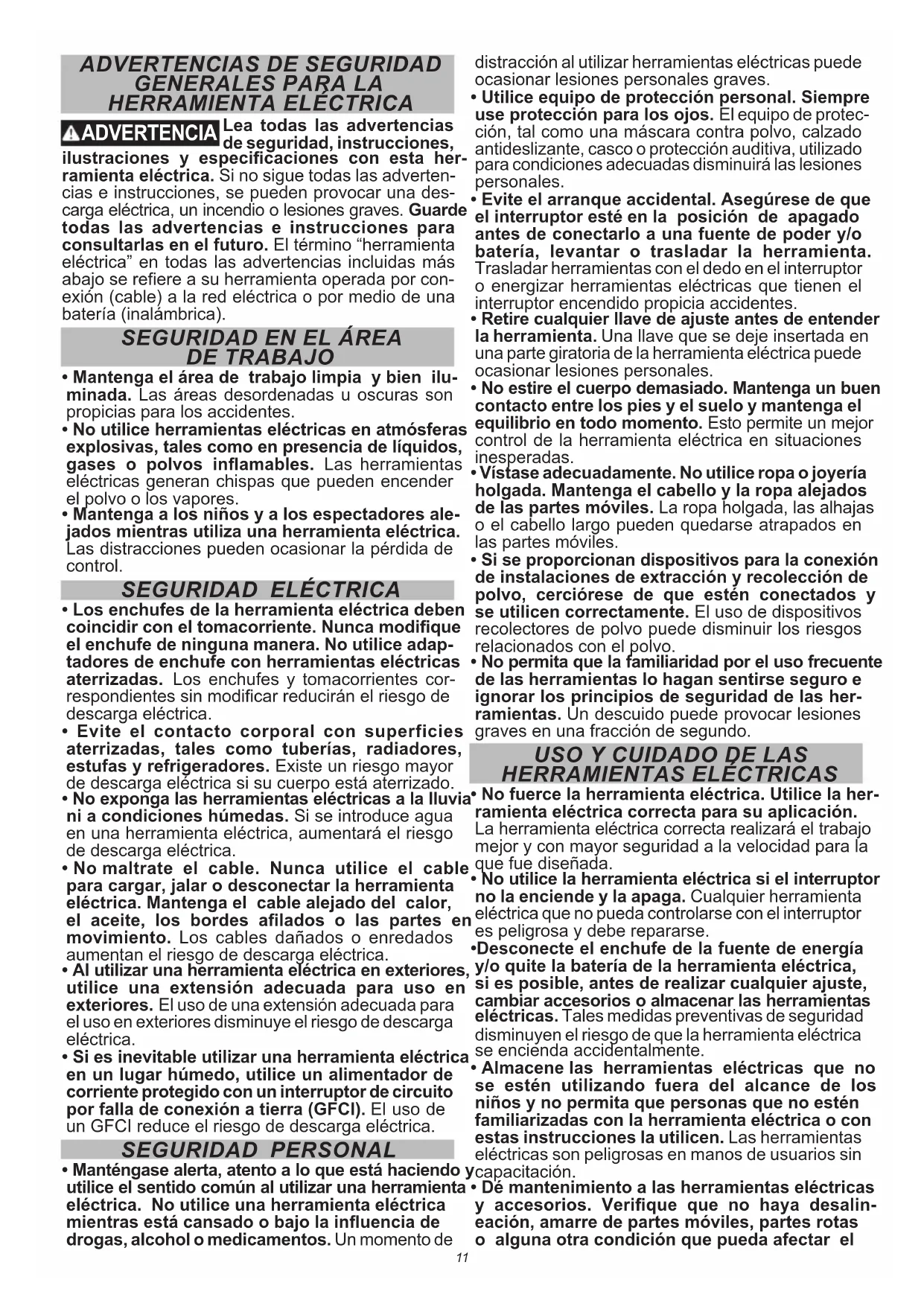- Manténgase alerta, atento a lo que está haciendo y utilice el sentido común al utilizar una herramienta eléctrica. No utilice una herramienta eléctrica mientras está cansado o bajo la inuencia de drogas, alcohol o medicamentos. Un momento de distracción al utilizar herramientas eléctricas puede ocasionar lesiones personales graves.