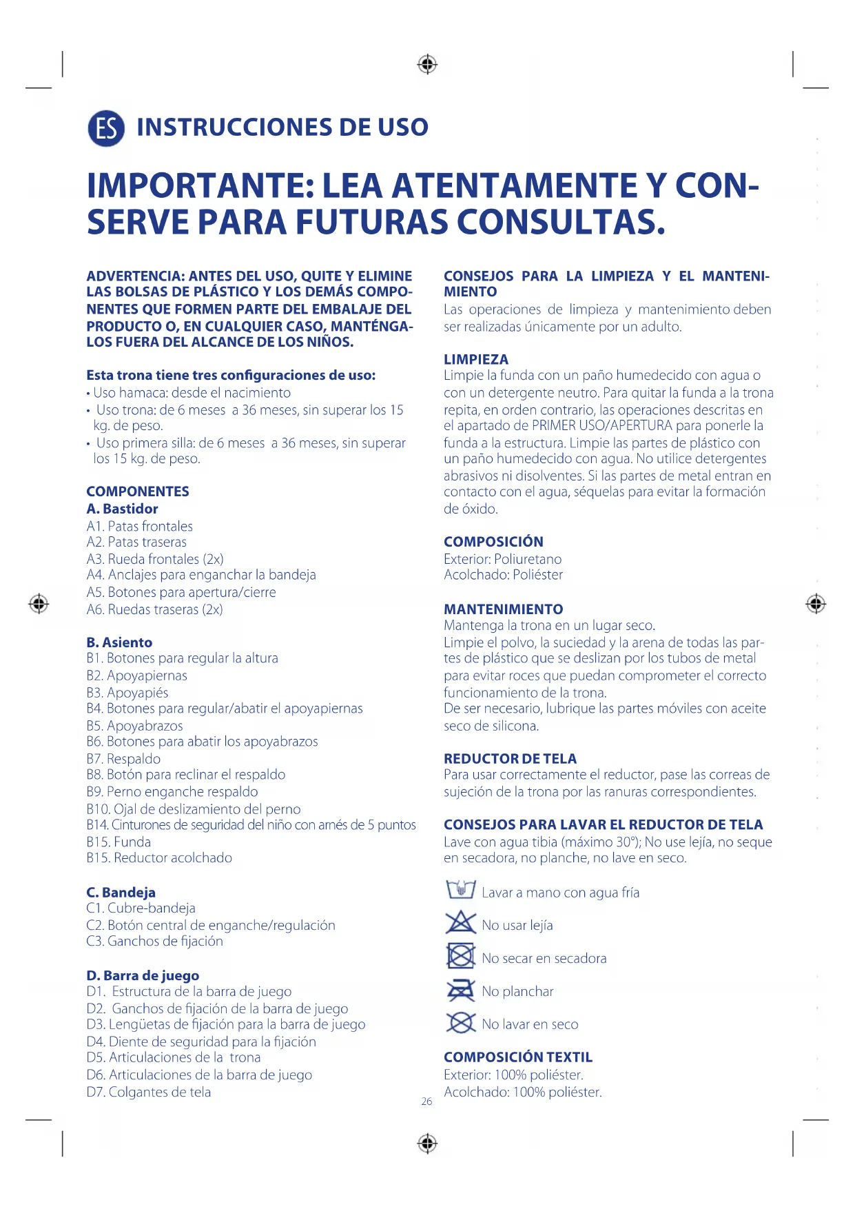 - Uso primera silla: de 6 meses a 36 meses, sin superar los 15 kg. de peso. COMPONENTES A. Bastidor A1. Patas frontales A2. Patas traseras A3. Rueda frontales (2x) A4. Anclajes para enganchar la bandeja A5. Botones para apertura/cierre A6. Ruedas traseras (2x) B. Asiento B1. Botones para regular la altura B2. Apoyapiernas B3. Apoyapiés B4. Botones para regular/abatir el apoyapiernas B5. Apoyabrazos B6. Botones para abatir los apoyabrazos B7. Respaldo B8. Botón para reclinar el respaldo B9. Perno enganche respaldo B10. Ojal de deslizamiento del perno B14. Cinturones de seguridad del niño con arnés de 5 puntos B15. Funda B15. Reductor acolchado C. Bandeja C1. Cubre-bandeja C2. Botón central de enganche/regulación C3. Ganchos de jación D. Barra de juego D1. Estructura de la barra de juego D2. Ganchos de jación de la barra de juego D3. Lengüetas de jación para la barra de juego D4. Diente de seguridad para la jación D5. Articulaciones de la trona D6. Articulaciones de la barra de juego D7. Colgantes de tela CONSEJOS PARA LA LIMPIEZA Y EL MANTENI- MIENTO Las operaciones de limpieza y mantenimiento deben ser realizadas únicamente por un adulto. LIMPIEZA Limpie la funda con un paño humedecido con agua o con un detergente neutro. Para quitar la funda a la trona repita, en orden contrario, las operaciones descritas en el apartado de PRIMER USO/APERTURA para ponerle la funda a la estructura. Limpie las partes de plástico con un paño humedecido con agua. No utilice detergentes abrasivos ni disolventes. Si las partes de metal entran en contacto con el agua, séquelas para evitar la formación de óxido. COMPOSICIÓN Exterior: Poliuretano Acolchado: Poliéster MANTENIMIENTO Mantenga la trona en un lugar seco. Limpie el polvo, la suciedad y la arena de todas las par- tes de plástico que se deslizan por los tubos de metal para evitar roces que puedan comprometer el correcto funcionamiento de la trona. De ser necesario, lubrique las partes móviles con aceite seco de silicona.