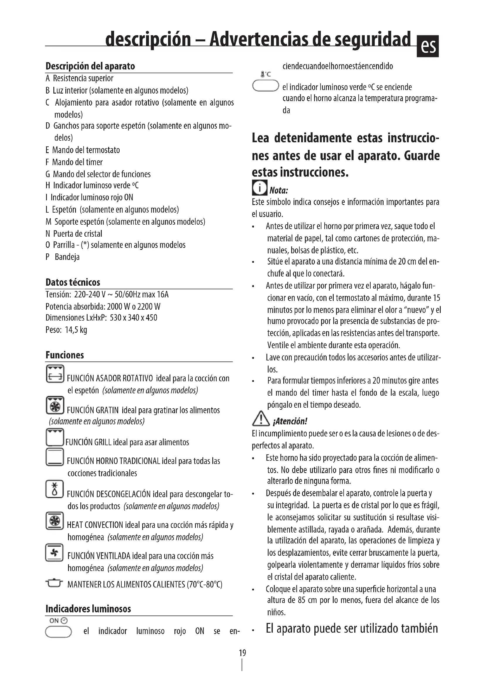 Descripción del aparato A Resistencia superior B Luz interior (solamente en algunos modelos) C Alojamiento para asador rotativo (solamente en algunos modelos) D Ganchos para soporte espetón (solamente en algunos mo- delos) E Mando del termostato F Mando del timer G Mando del selector de funciones H Indicador luminoso verde ºC I Indicador luminoso rojo ON L Espetón (solamente en algunos modelos) M Soporte espetón (solamente en algunos modelos) N Puerta de cristal O Parrilla - (*) solamente en algunos modelos P Bandeja Datos técnicos Tensión: 220-240 V ~ 50/60Hz max 16A Potencia absorbida: 2000 W o 2200 W Dimensiones LxHxP: 530 x 340 x 450 Peso: 14,5 kg Funciones FUNCIÓN ASADOR ROTATIVO ideal para la cocción con el espetón (solamente en algunos modelos) FUNCIÓN GRATIN ideal para gratinar los alimentos (solamente en algunos modelos) FUNCIÓN GRILL ideal para asar alimentos FUNCIÓN HORNO TRADICIONAL ideal para todas las cocciones tradicionales FUNCIÓN DESCONGELACIÓN ideal para descongelar to- dos los productos (solamente en algunos modelos) HEAT CONVECTION ideal para una cocción más rápida y homogénea (solamente en algunos modelos) FUNCIÓN VENTILADA ideal para una cocción más homogénea (solamente en algunos modelos) MANTENER LOS ALIMENTOS CALIENTES (70°C-80°C) Indicadores luminosos el indicador luminoso rojo ON se en- ciende cuando el horno está encendido el indicador luminoso verde ºC se enciende cuando el horno alcanza la temperatura programa-