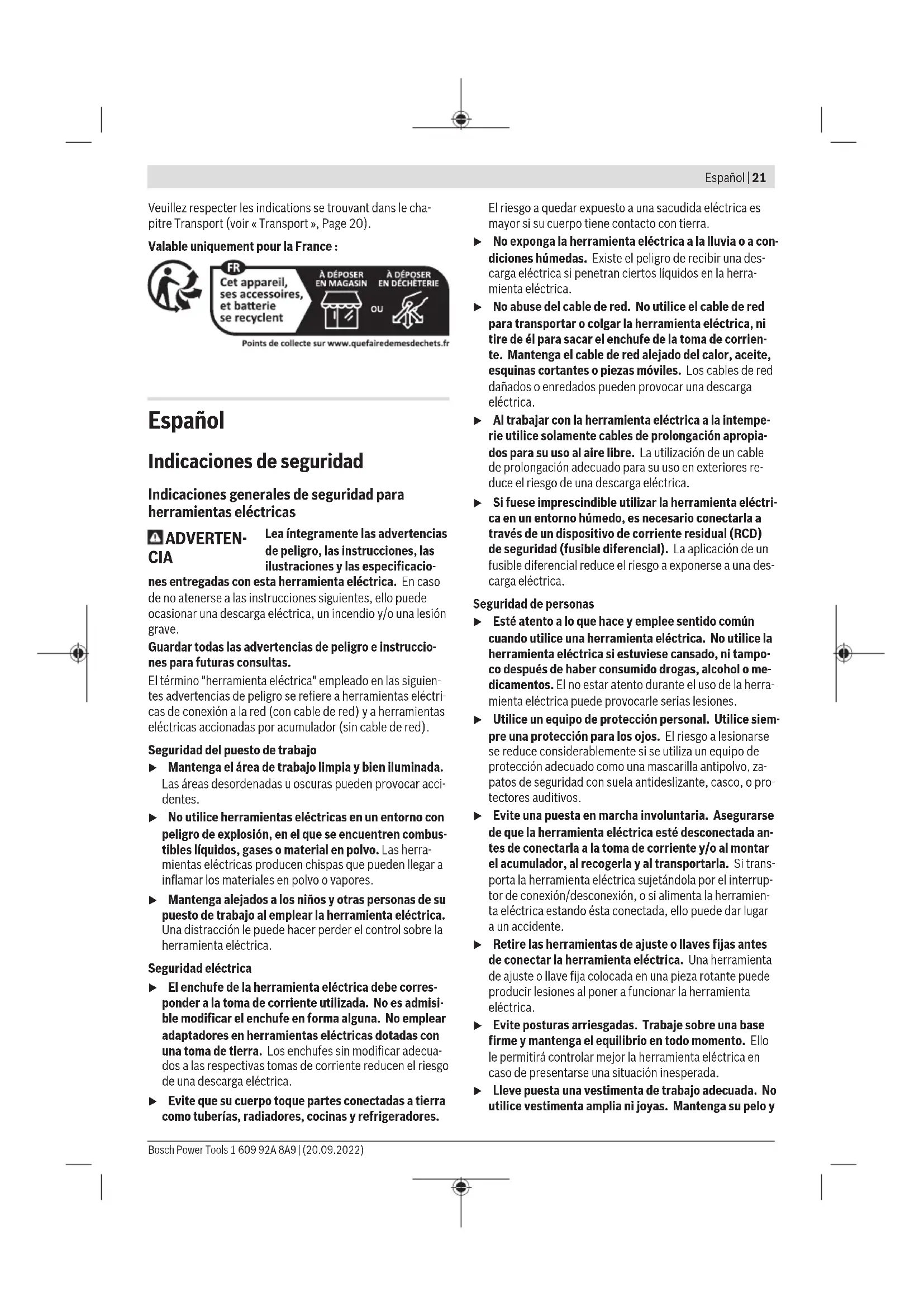 El nivel de vibraciones y el valor de emisiones de ruidos indi- cados en estas instrucciones han sido determinados según un procedimiento de medición normalizado y pueden servir como base de comparación con otras herramientas eléctri- cas. También son adecuados para estimar provisionalmente la emisión de vibraciones y ruidos. El nivel de vibraciones y el valor de emisiones de ruidos indi- cados han sido determinados para las aplicaciones principa- les de la herramienta eléctrica. Por ello, el nivel de vibracio- nes y el valor de emisiones de ruidos pueden ser diferentes si la herramienta eléctrica se utiliza para otras aplicaciones, con útiles diferentes, o si el mantenimiento de la misma fue- se deficiente. Ello puede suponer un aumento drástico de la emisión de vibraciones y de ruidos durante el tiempo total de trabajo. Bosch Power Tools 1 609 92A 8A9 | (20.09.2022)24 | Español Para determinar con exactitud las emisiones de vibraciones y de ruidos, es necesario considerar también aquellos tiem- pos en los que el aparato esté desconectado, o bien, esté en funcionamiento, pero sin ser utilizado realmente. Ello puede suponer una disminución drástica de las emisiones de vibra- ciones y de ruidos durante el tiempo total de trabajo. Fije unas medidas de seguridad adicionales para proteger al usuario de los efectos por vibraciones, como por ejemplo: Mantenimiento de la herramienta eléctrica y de los útiles, conservar calientes las manos, organización de las secuen- cias de trabajo. Acumulador Bosch también vende herramientas eléctricas accionadas por acumulador sin acumulador. En el embalaje puede ver si un acumulador está incluido en el volumen de suministro de su herramienta eléctrica. Carga del acumulador u Utilice únicamente los cargadores que se enumeran en los datos técnicos. Solamente estos cargadores han sido especialmente adaptados a los acumuladores de io- nes de litio empleados en su herramienta eléctrica. Indicación: Los acumuladores de iones de litio se entregan parcialmente cargados debido a la normativa de transporte internacional. Con el fin de obtener la plena potencia del acumulador, cargue completamente el acumulador antes de su primer uso. Montaje del acumulador Desplace el acumulador cargado en el alojamiento del acu- mulador, hasta que encastre perceptible. Desmontaje del acumulador Para la extracción del acumulador, presione la tecla de de- senclavamiento y retire el acumulador. No proceda con brusquedad. El acumulador dispone de 2etapas de enclavamiento para evitar que se salga en el caso de un accionamiento acciden- tal de la tecla de desenclavamiento del acumulador. Mien- tras la batería esté montada en la herramienta eléctrica, per- manecerá retenida en su posición mediante un resorte. Indicador del estado de carga del acumulador Los LEDs verdes del indicador del estado de carga del acu- mulador indican el estado de carga del acumulador. Por mo- tivos de seguridad, la consulta del estado de carga es solo posible con la herramienta eléctrica parada. Presione la tecla del indicador de estado de carga o , para indicar el estado de carga. Esto también es posible con el acumulador desmontado. Si tras presionar la tecla del indicador de estado de carga no se enciende ningún LED, significa que el acumulador está defectuoso y debe sustituirse. Tipo de acumulador GBA18V... Diodo luminoso (LED) Capacidad Luz permanente 3× verde 60–100% Luz permanente 2× verde 30–60% Luz permanente 1× verde 5–30% Luz intermitente 1× verde 0–5% Tipo de acumulador ProCORE18V... Diodo luminoso (LED) Capacidad Luz permanente 5× verde 80–100% Luz permanente 4× verde 60–80% Luz permanente 3× verde 40–60% Luz permanente 2× verde 20–40% Luz permanente 1× verde 5–20% Luz intermitente 1× verde 0–5% Indicaciones para el trato óptimo del acumulador Proteja el acumulador de la humedad y del agua. Únicamente almacene el acumulador en el margen de tem- peratura desde −20°C hasta 50°C. P.ej., no deje el acumu- lador en el coche en verano. Limpie de vez en cuando las rejillas de refrigeración del acu- mulador con un pincel suave, limpio y seco. Si después de una recarga, el tiempo de funcionamiento del acumulador fuese muy reducido, ello es señal de que éste está agotado y deberá sustituirse. Observe las indicaciones referentes a la eliminación. Operación Puesta en marcha Conexión/desconexión Para conectar la herramienta eléctrica, desplace el interrup- tor de conexión/desconexión(3) hacia delante, para que aparezca I en el interruptor. Para desconectar la herramienta eléctrica, desplace el inte- rruptor de conexión/desconexión(3) hacia atrás, para que aparezca 0 en el interruptor. Protección contra rearranque La protección contra rearranque evita la puesta en marcha accidental de la herramienta eléctrica tras un corte de la ali- mentación eléctrica. Para la nueva puesta en marcha, coloque el interruptor de conexión/desconexión(3) en la posición de desconexión y conecte de nuevo la herramienta eléctrica. 1 609 92A 8A9 | (20.09.2022) Bosch Power ToolsEspañol | 25 Arranque suave El arranque suave reduce el par obtenido en el momento del arranque e incrementa la vida útil del motor. Cambio de dirección de corte Para el cambio de la dirección de corte, el portamatriz(7) se puede girar en tres posiciones desfasadas respectivamente en 90°. No es posible ajustar el sentido de corte hacia atrás (en dirección a la carcasa). Para girar el portamatriz(7) suelte el tornillo(4), hasta que pueda girar el portamatriz. Gírelo en 90° con respecto al eje longitudinal de la herramienta eléctrica hacia la derecha o hacia la izquierda. Asegúrese de que el tornillo(4) encaje en el orificio del portamatriz(7). Apriete el tornillo. Instrucciones para la operación u Desmonte el acumulador antes de manipular la herra- mienta eléctrica (p. ej. en el mantenimiento, cambio de útil, etc.) así como al transportarla y guardarla