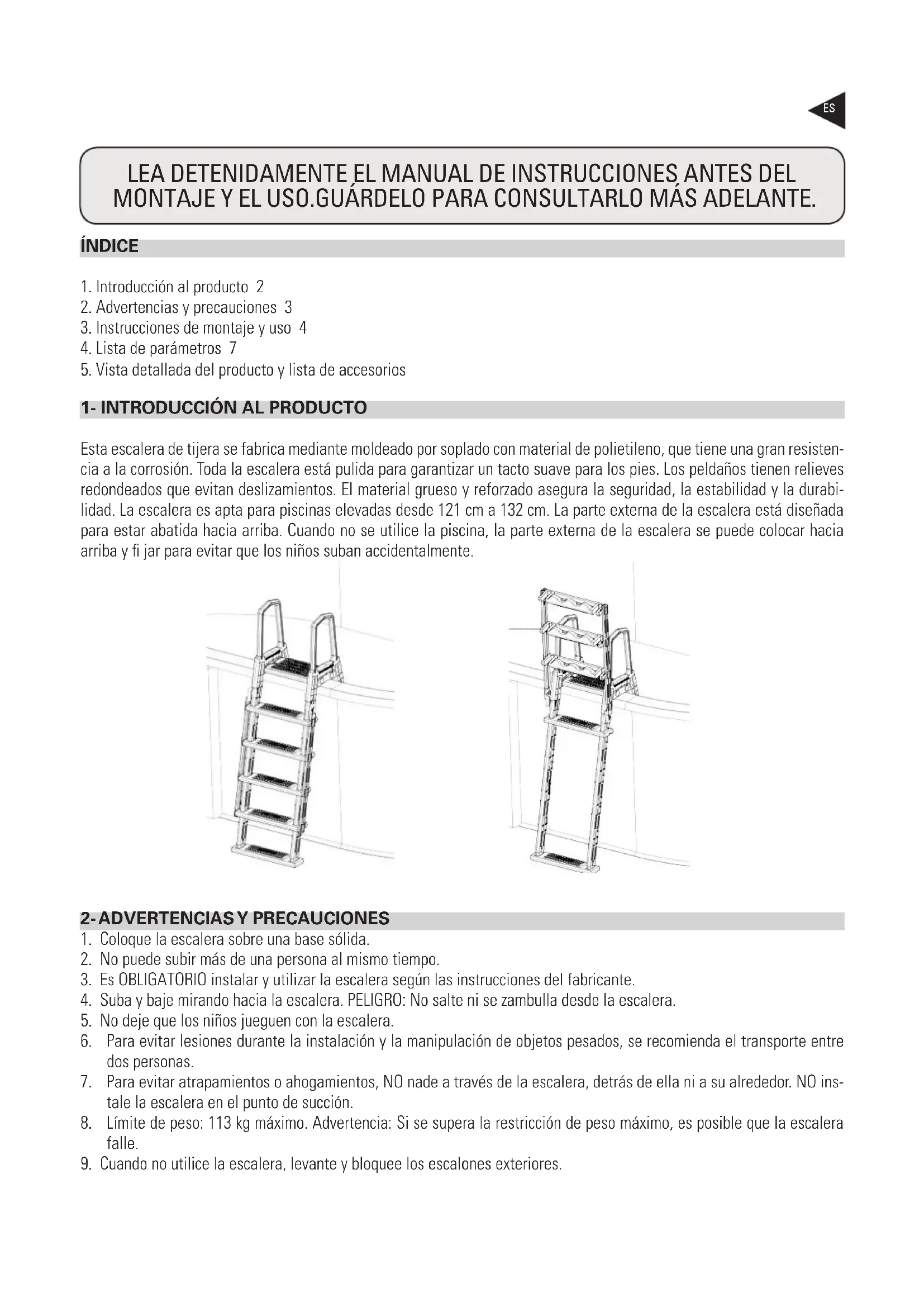 Esta escalera de tijera se fabrica mediante moldeado por soplado con material de polietileno, que tiene una gran resisten- cia a la corrosión. Toda la escalera está pulida para garantizar un tacto suave para los pies. Los peldaños tienen relieves redondeados que evitan deslizamientos. El material grueso y reforzado asegura la seguridad, la estabilidad y la durabi- lidad. La escalera es apta para piscinas elevadas desde 121 cm a 132 cm. La parte externa de la escalera está diseñada para estar abatida hacia arriba. Cuando no se utilice la piscina, la parte externa de la escalera se puede colocar hacia arriba y fi jar para evitar que los niños suban accidentalmente.